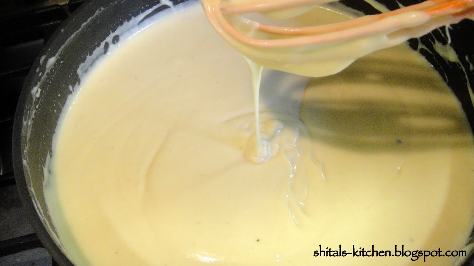 Whisk in little milk at a time to avoid lumps till you obtain a sauce like consistency. I used around 5 cups of milk. Add grated cheese, bit of salt and pepper. Add herbs of your choice.