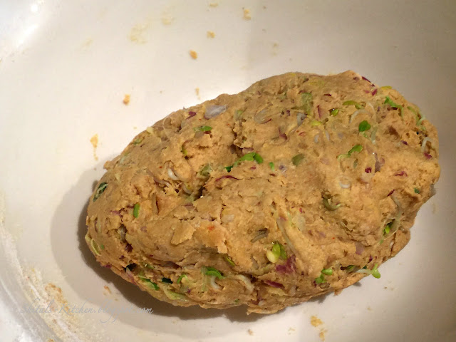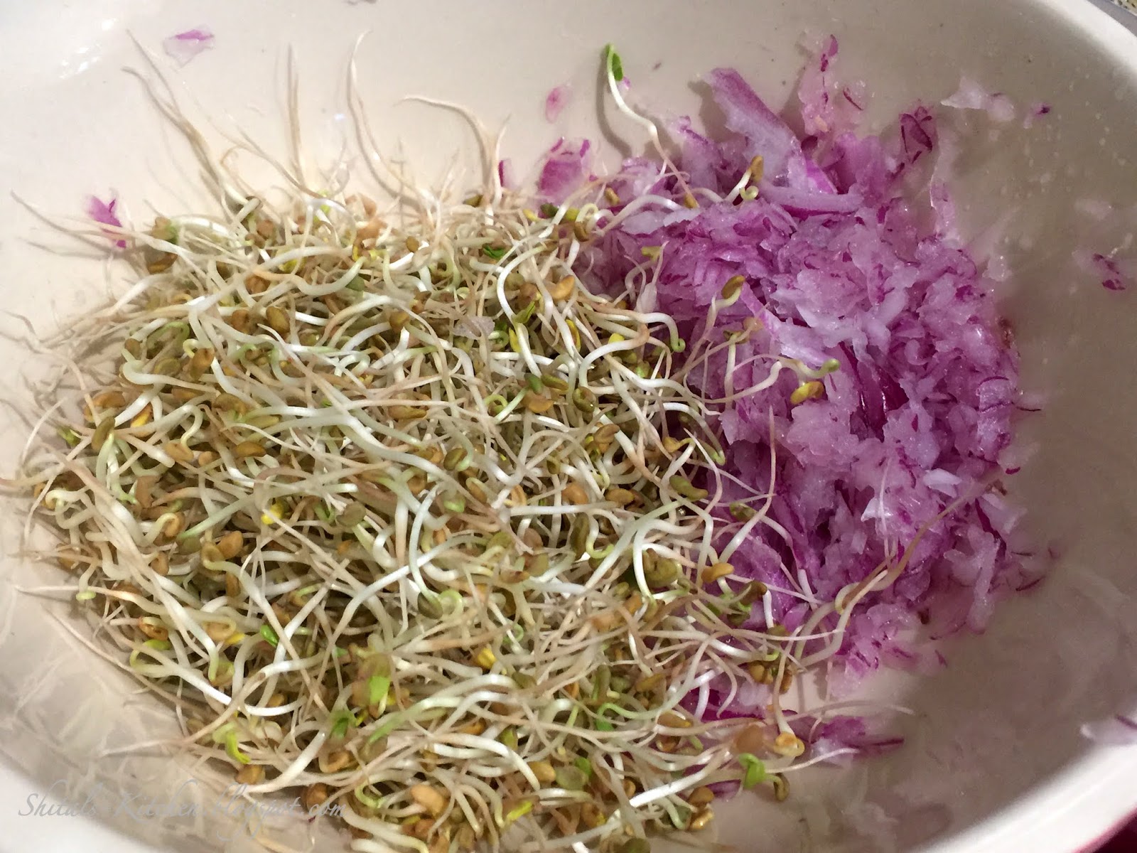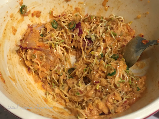 - Mix grated onion, sprouts, salt, chopped green chili, turmeric and red chili powder together and let it rest for 5-7 minutes.