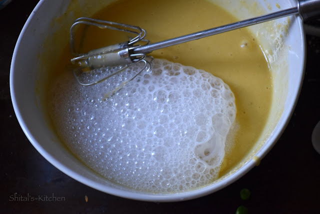 • Add Eno fruit salt and 1/4 cup of water and whisk well. The batter will froth and become light and airy.