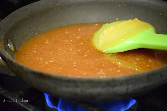 - In a heavy bottom pan heat sugar with a tbsp. of water on medium heat stirring constantly till sugar melts completely. It will slightly brown. Mine became slightly more dark as I was also taking pictures but you should work fast to avoid getting caramelized.