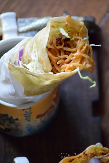 This post is my trial to different stuffing. This Frankie is stuffed with spicy schezwan noodles. On the bed of crunchy cabbage and chopped onions, it has perfect flavor and texture.