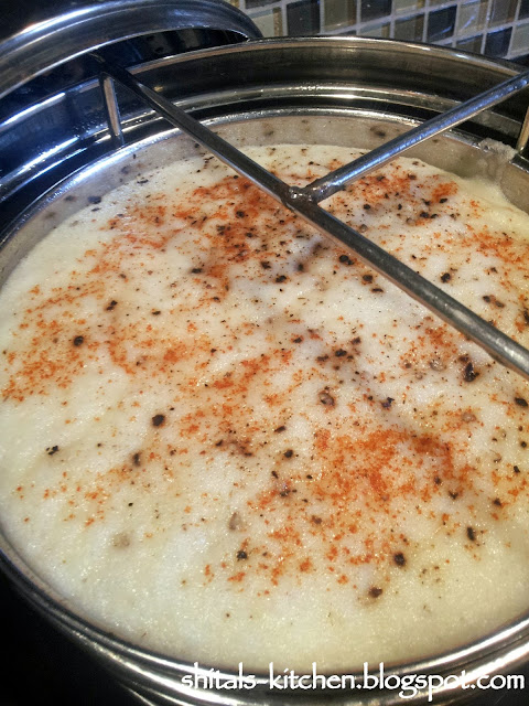 - Grease a dhokla plate well with oil. Add batter to the plate till it covers 1/4 inch in the plate. Steamed for 5-8 minutes.