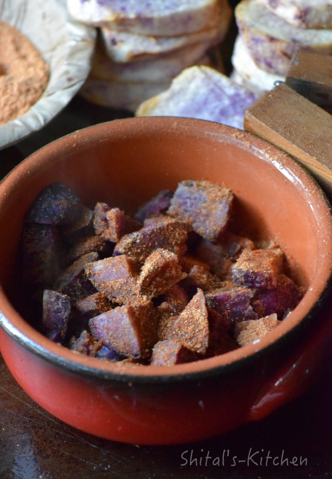 - Peel yam or scrape the peel lightly. Slit and keep it aside.