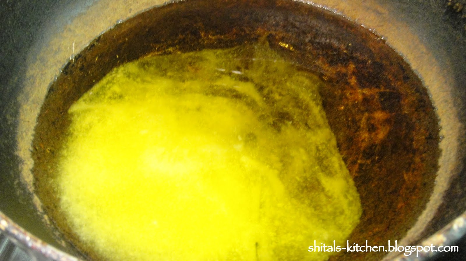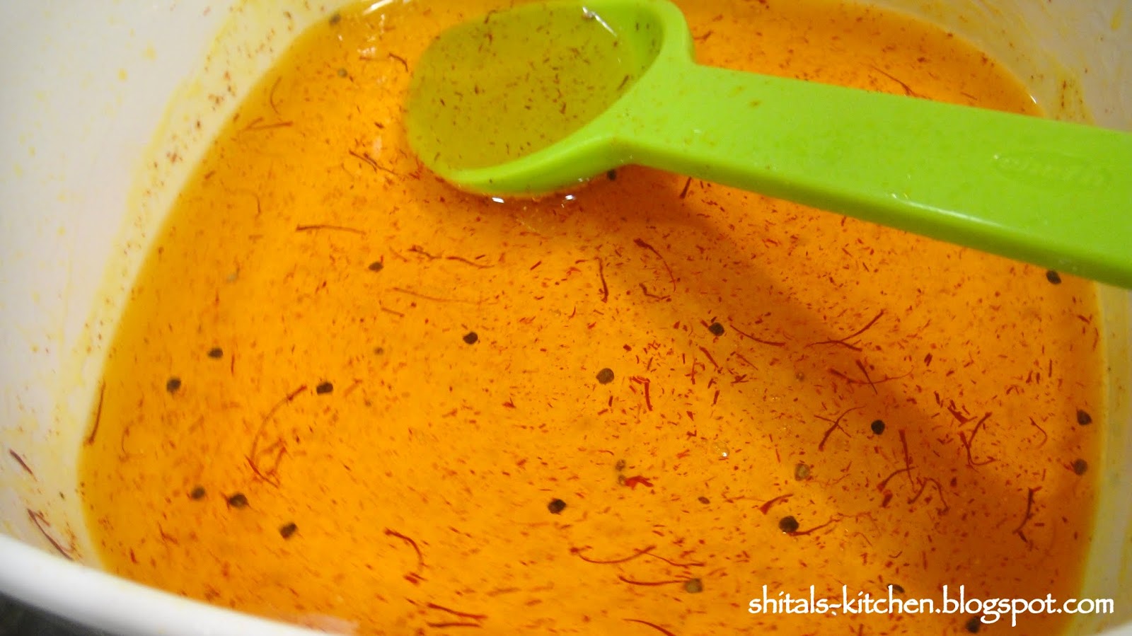 To make the sugar syrup, combine water and sugar and bring it to a boil stirring continuously. Add milk to the sugar syrup and let it simmer. Do not stir it. The impurities of the sugar will float on the syrup. These impurities can be removed slowly by using a ladle. Add crushed saffron to the syrup and let it boil for 2-3 mins till the syrup turns yellow. Remove from heat. Add cardamom powder and few seeds.