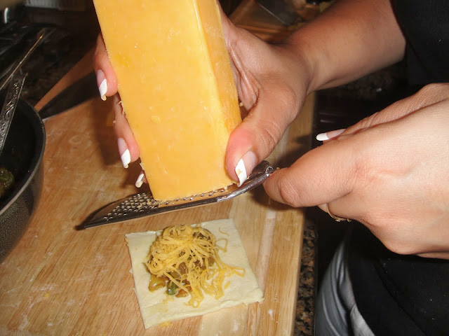 Make pastry dough cup in cupcake pan. Fill it with a tbsp. of filling and grated cheese. Bake for 20 min.
