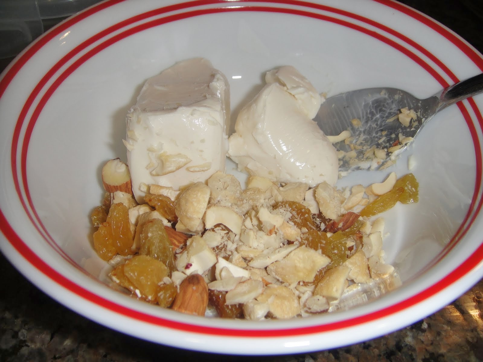 Mix cream cheese and dry fruits (finely chopped walnuts, raisins, almond, cashews) to make a smooth mixture.