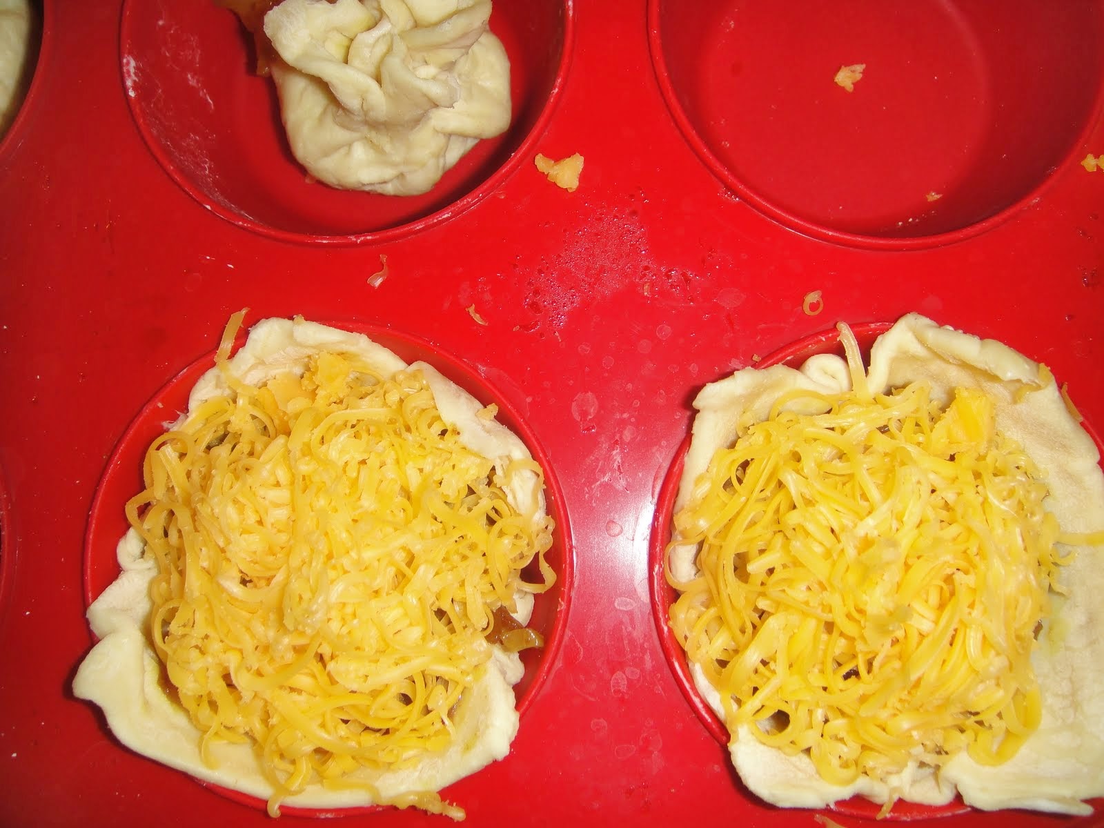 Make pastry dough cup in cupcake pan. Fill it with a tbsp. of filling and grated cheese. Bake for 20 min.