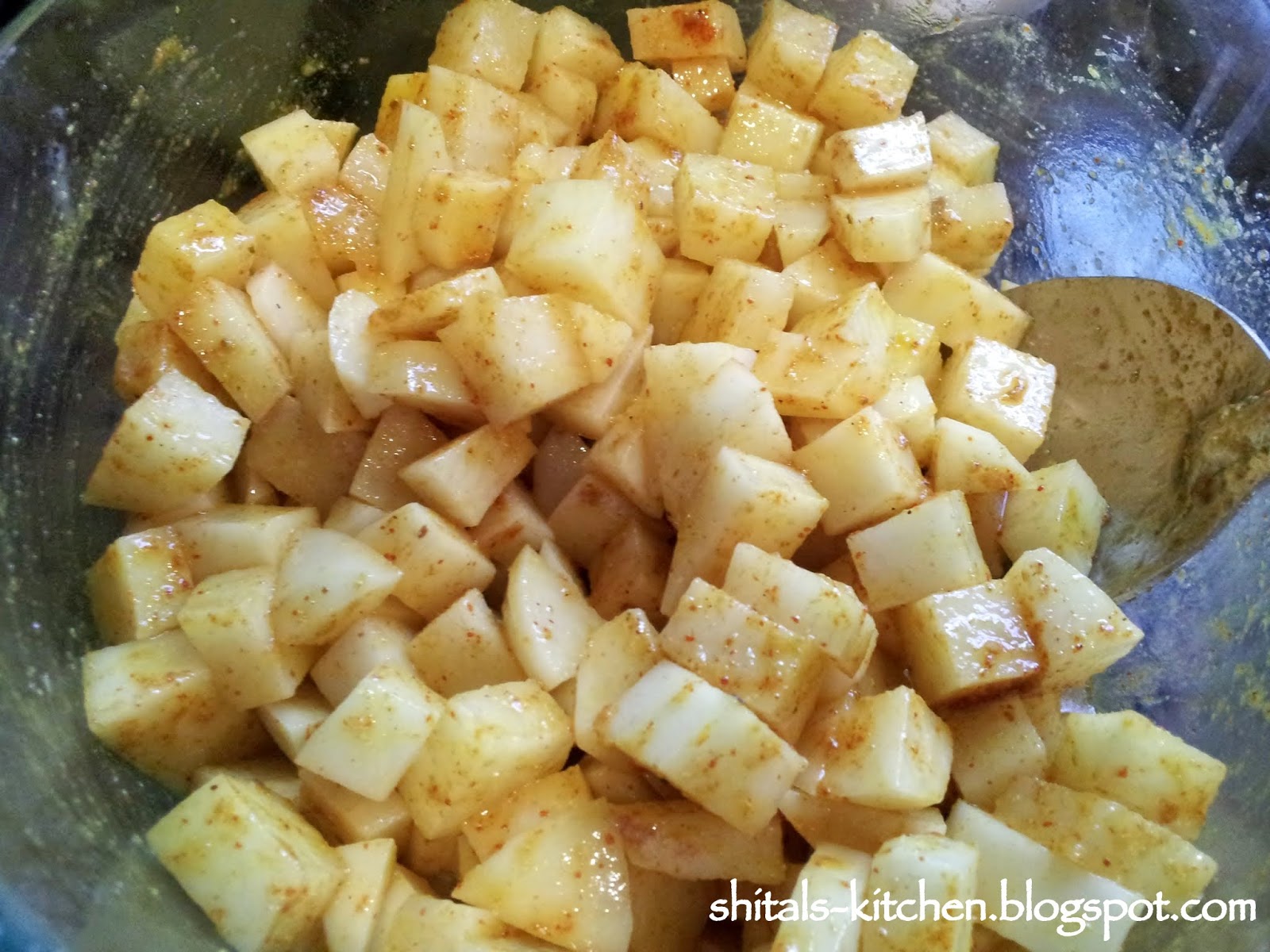 Add spices directly to potatoes: 1 tsp. tumeric powder, 1 tsp chilli powder, 1 tsp. coriander powder, 1 tsp MDH tava masala, 1 tsp raw mango powder (optional), and salt to taste.