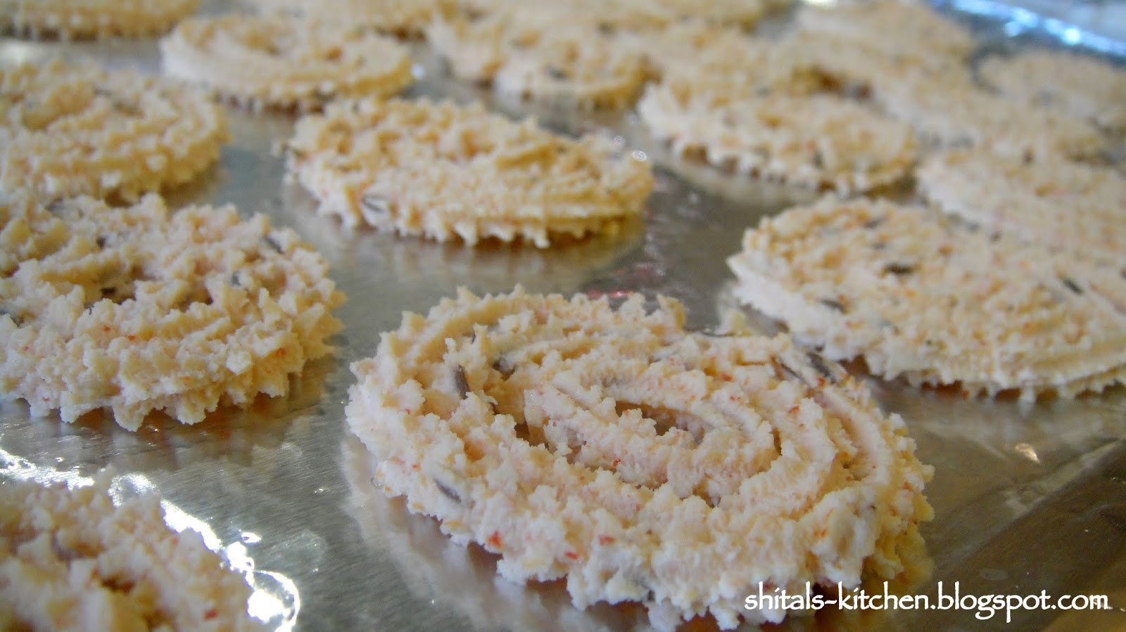 Lightly brush or spray some oil on the baking tray. Make swirls as you press the dough out of the disk.