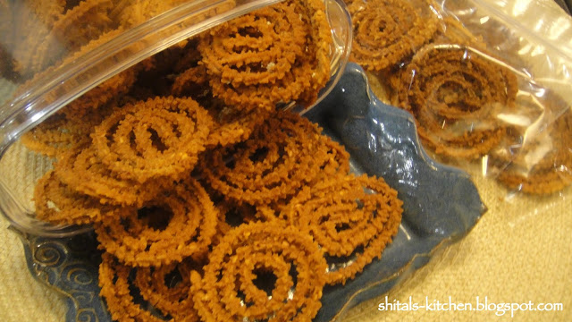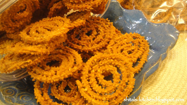 My favorite, and who does not love this crisp snack! Chakli or Chakri, as the name describes is a swirl or pinwheel, a crisp, deep fried snack. I remember, my sister and I would munch on these while my mom made these fresh chaklis . More than half of it would be gone before storing in an airtight container :) Fun and memorable moments!