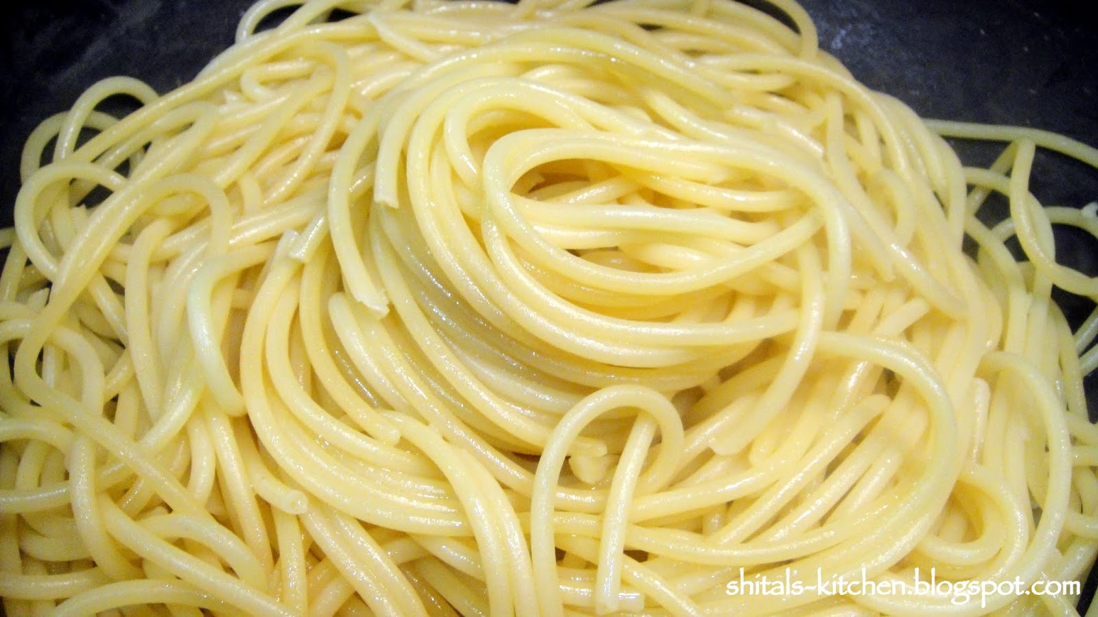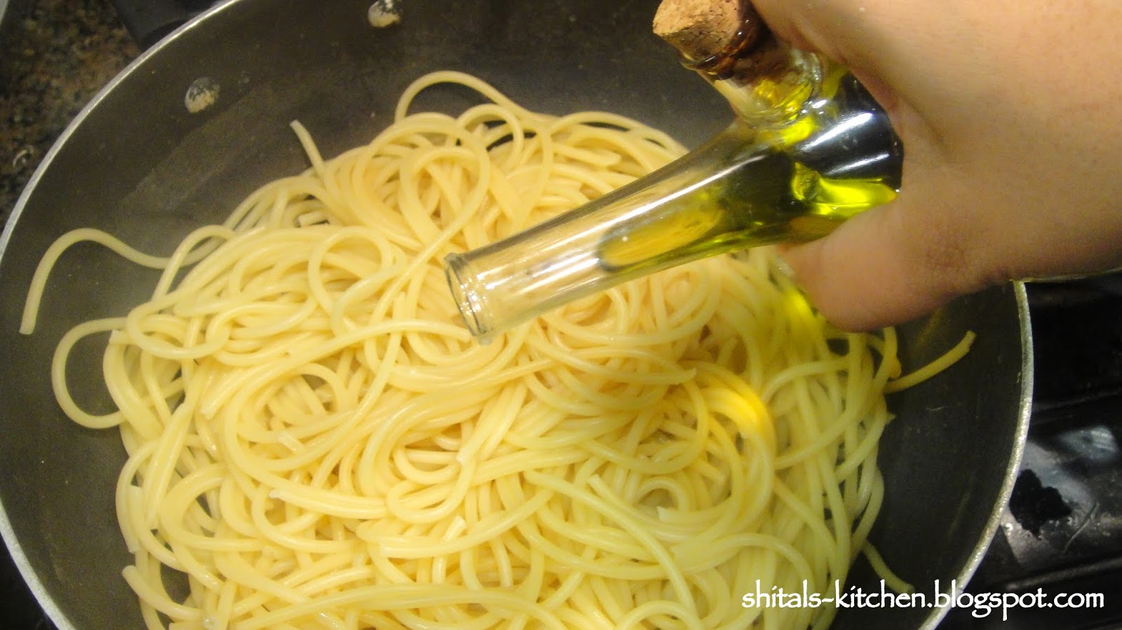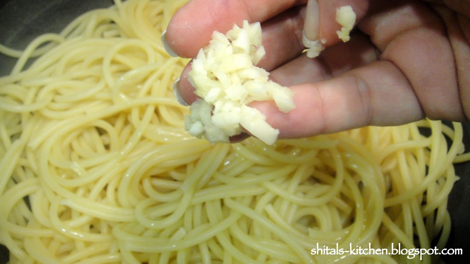 Drain excess water. Pour 1 tbsp. olive oil and chopped garlic over warm pasta. Mix well and cover the pot. Pasta absorbs all the garlic flavor...Delicious!!