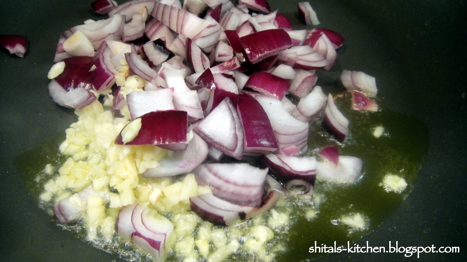 Meanwhile, heat the pan, add chopped garlic and onions and saute for a minute or two.