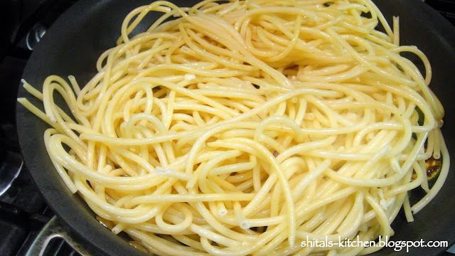Add boiled, garlic fused pasta.