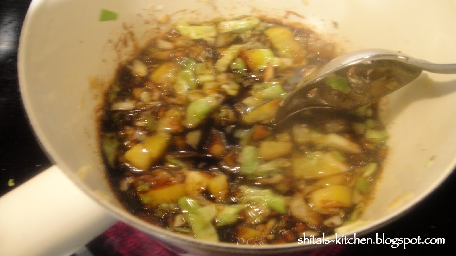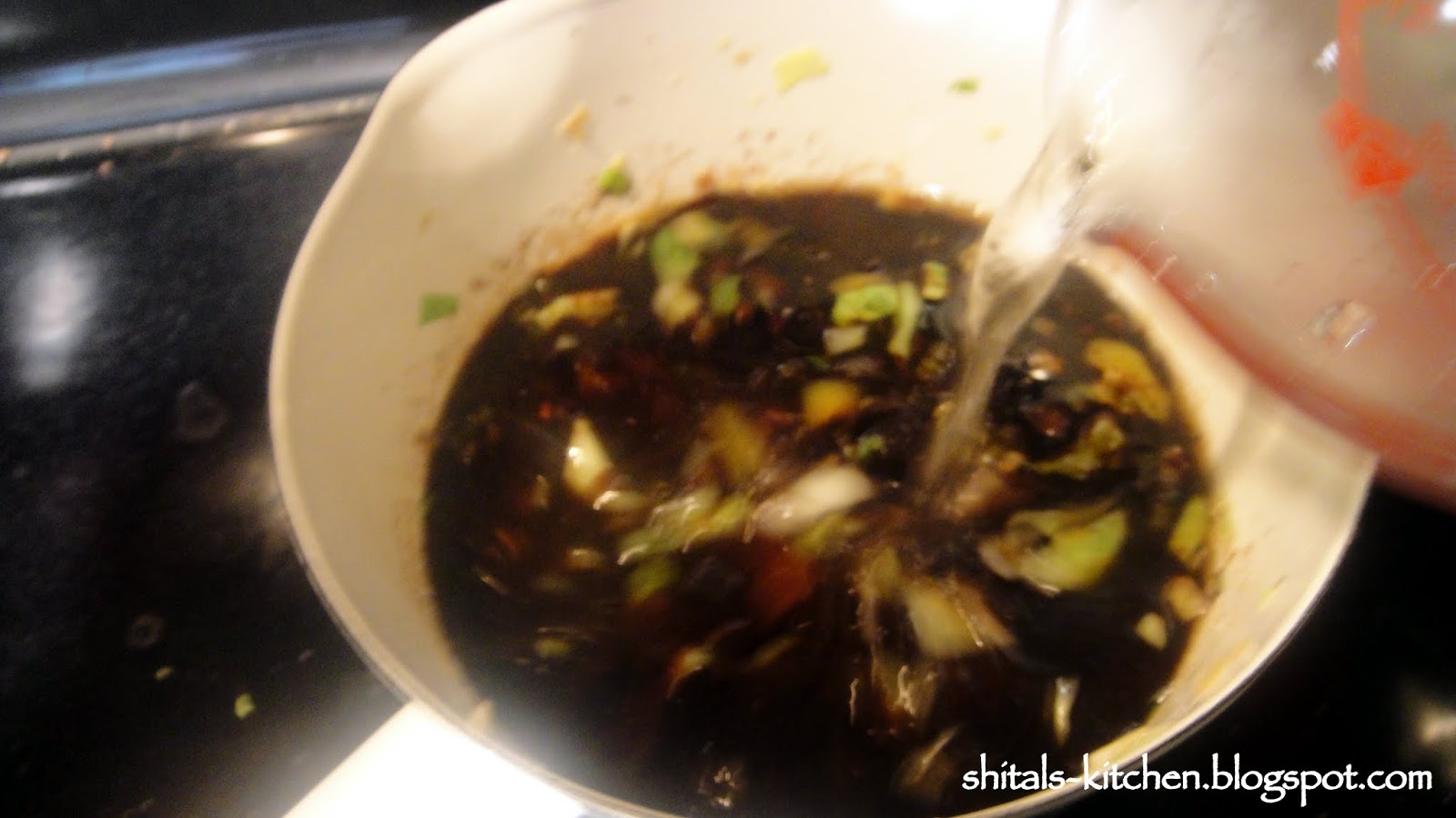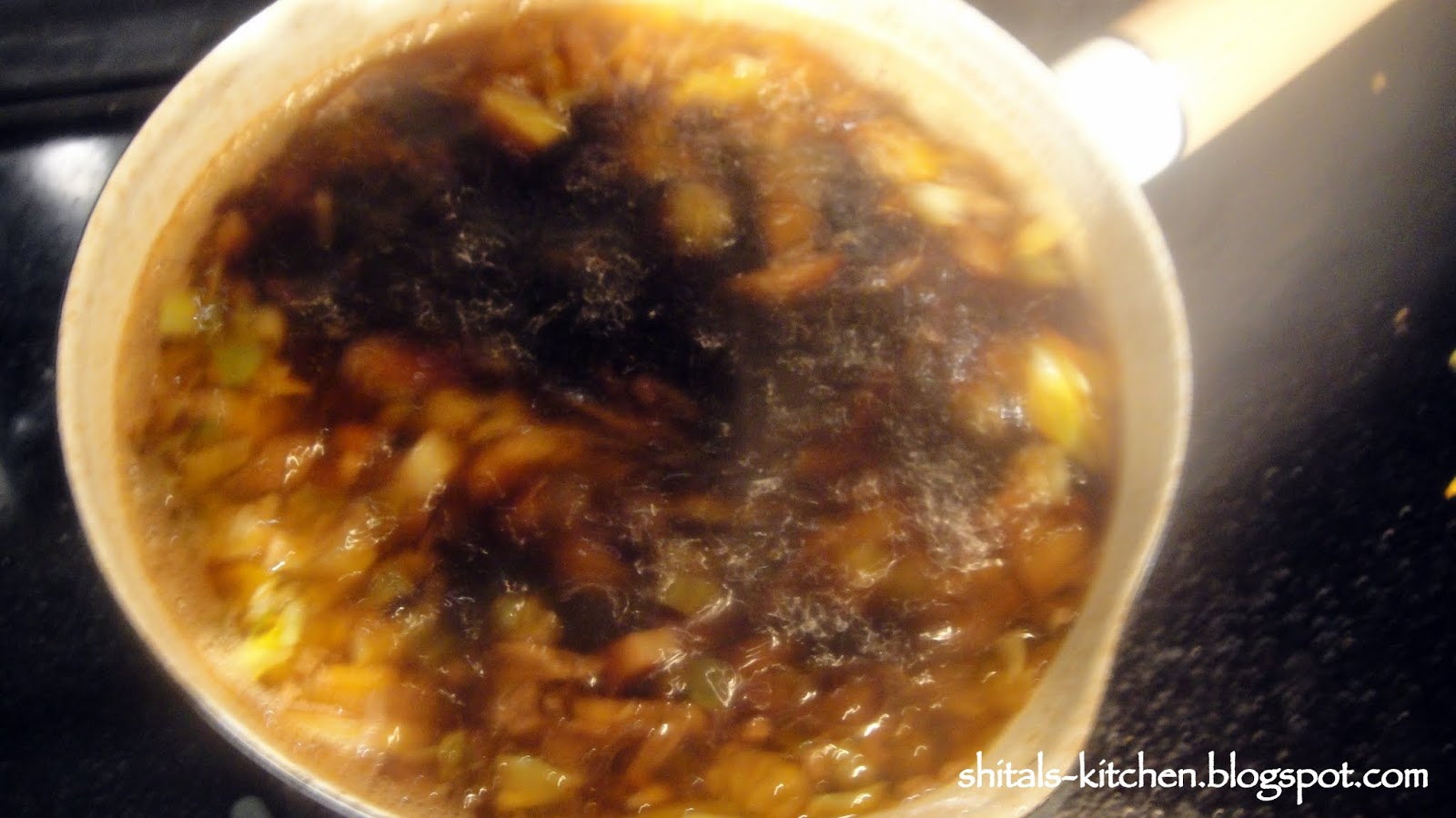 Add 2 tbsp of dark soy sauce, 3 cup water and 1 tbsp vinegar. Add some salt and pepper and bring the sauce to boil and simmer for 15 minutes. I like the flavor of veggies and seasoning infused in water to make a delicious and flavorful sauce. I also like to prepare this sauce broth few hours ahead of time to develop rich flavor.