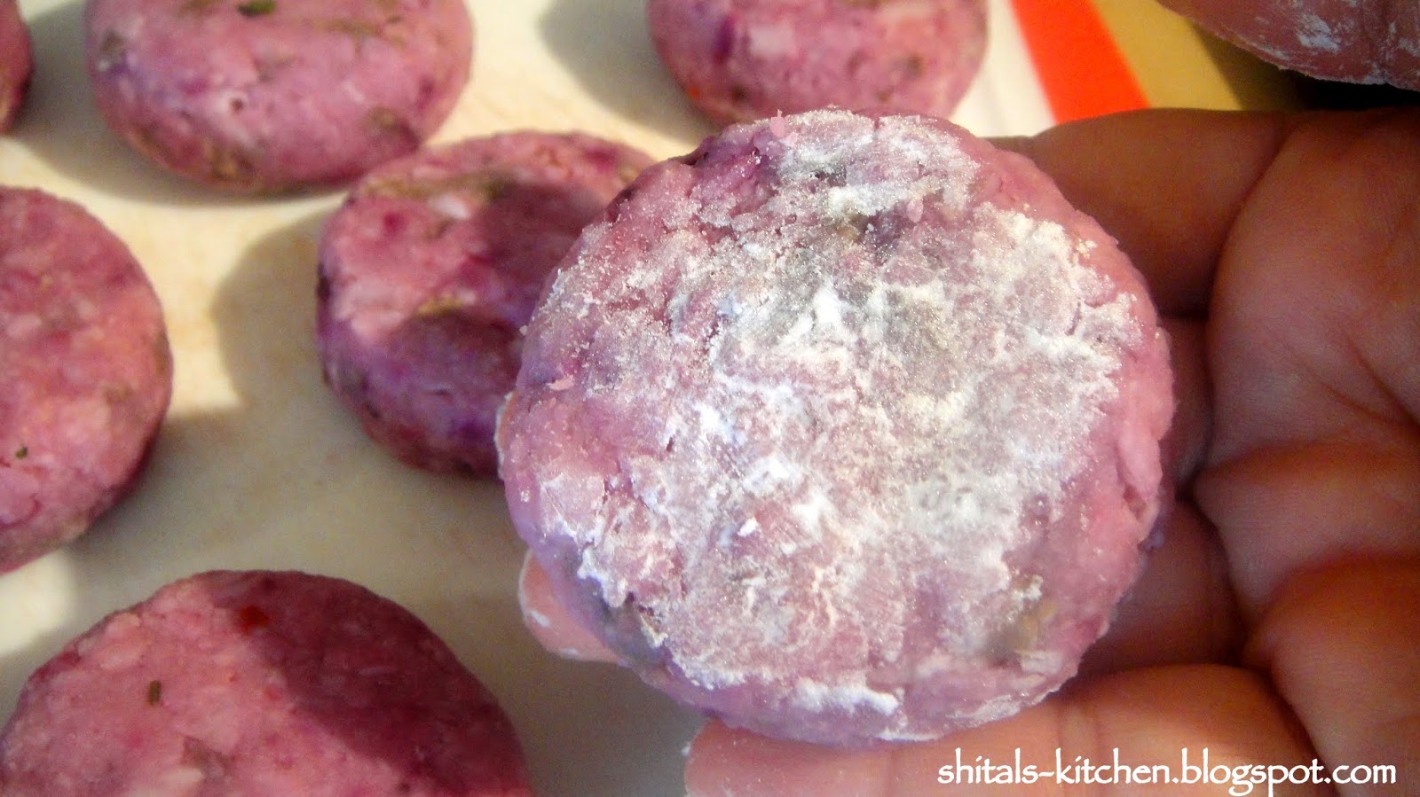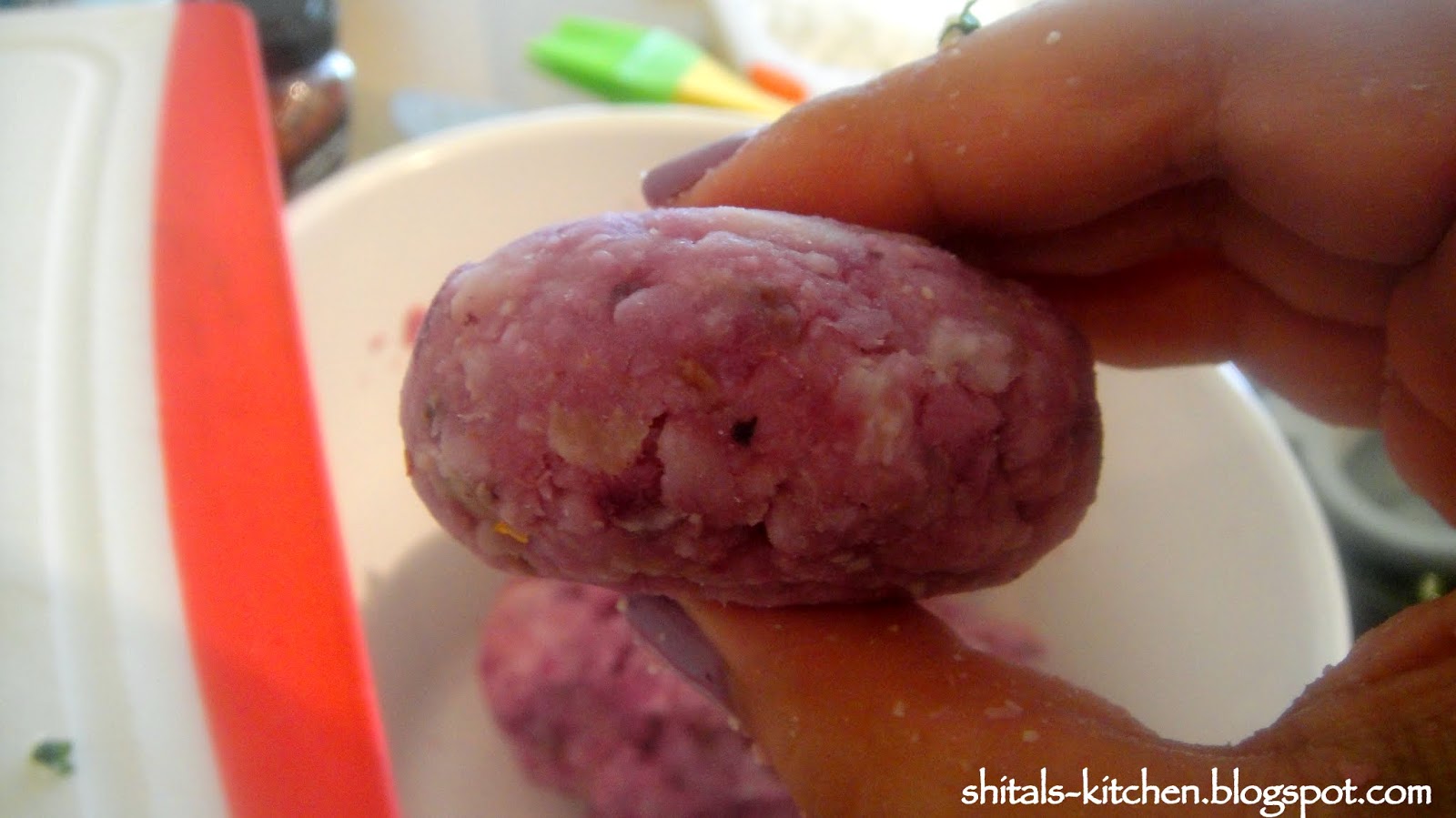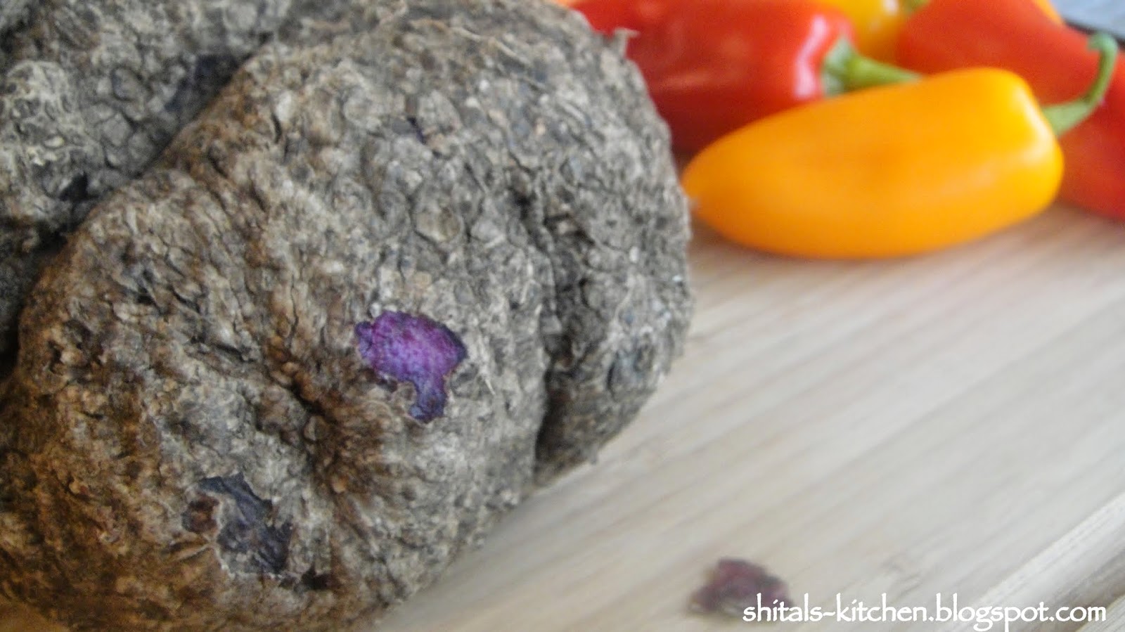 Purple Yam or Kandh or as know by many as Ratula is a Gujarati root. This root veggie is added to the most famous Gujarati mixed veggie Undhiyu. It is very rarely available fresh, so I had picked it up two days ago to make a delicious veggie delight. Since this was easily accessible in my fridge, I thought of making some stuffed patties. Do not confuse this with purple potato! Purple Potato is very different from Purple Yam. Later is a firm root, great to be eaten boiled or even fried with a hint of salt, pepper and lime. For all those who have been to Nathdwara/Shrinathji, I am sure you are getting nostalgic with the delicious, crisp, fried Kandh available there.