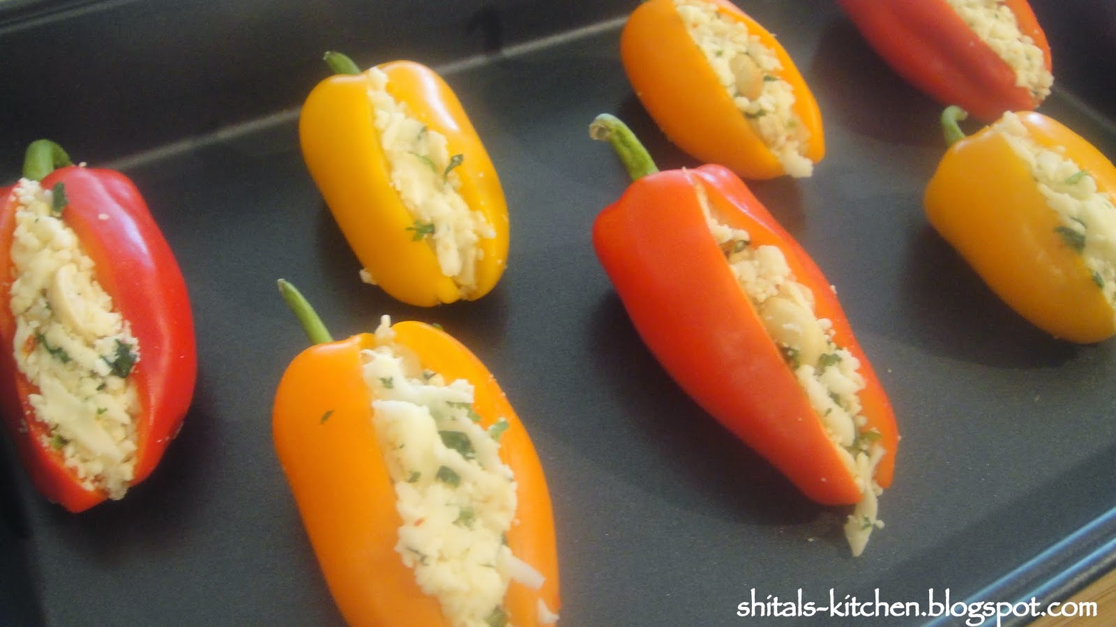Lightly brush with oil, and just before serving bake the peppers at 450 F for 6-7 minutes and broil for 3-4 minutes till the cheese melts and you see some color on the peppers.