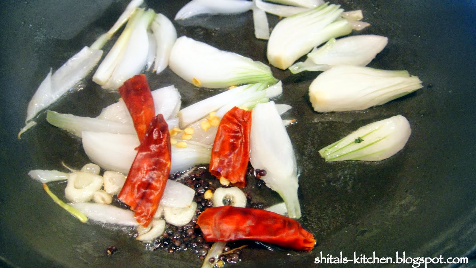 While these saute, add 1/4 tsp. mustard seeds and few dry red chillies.