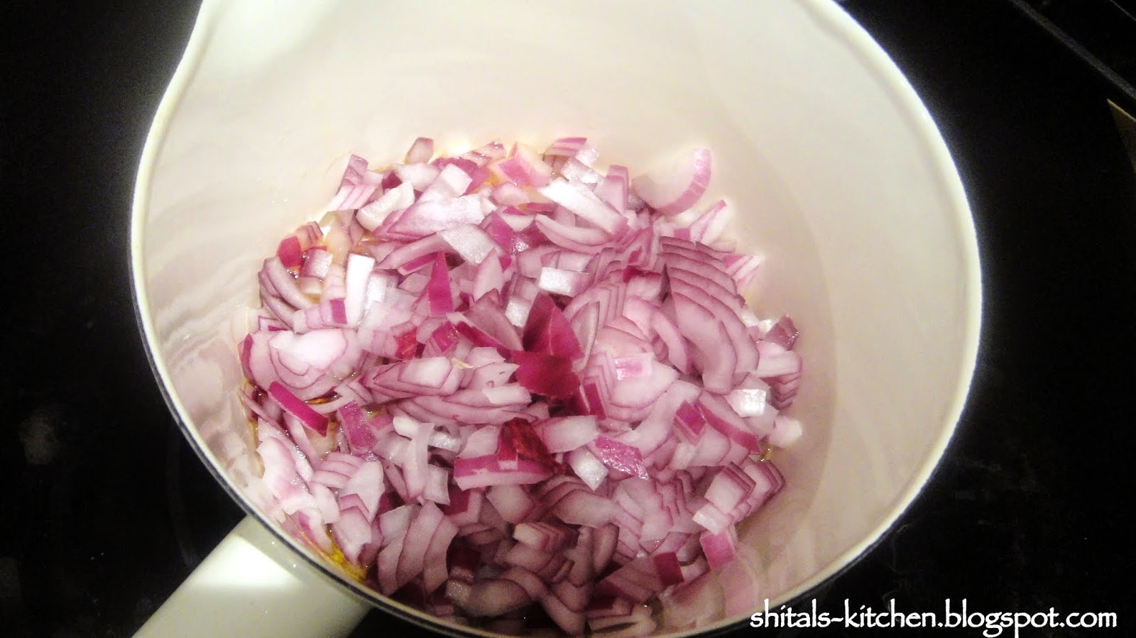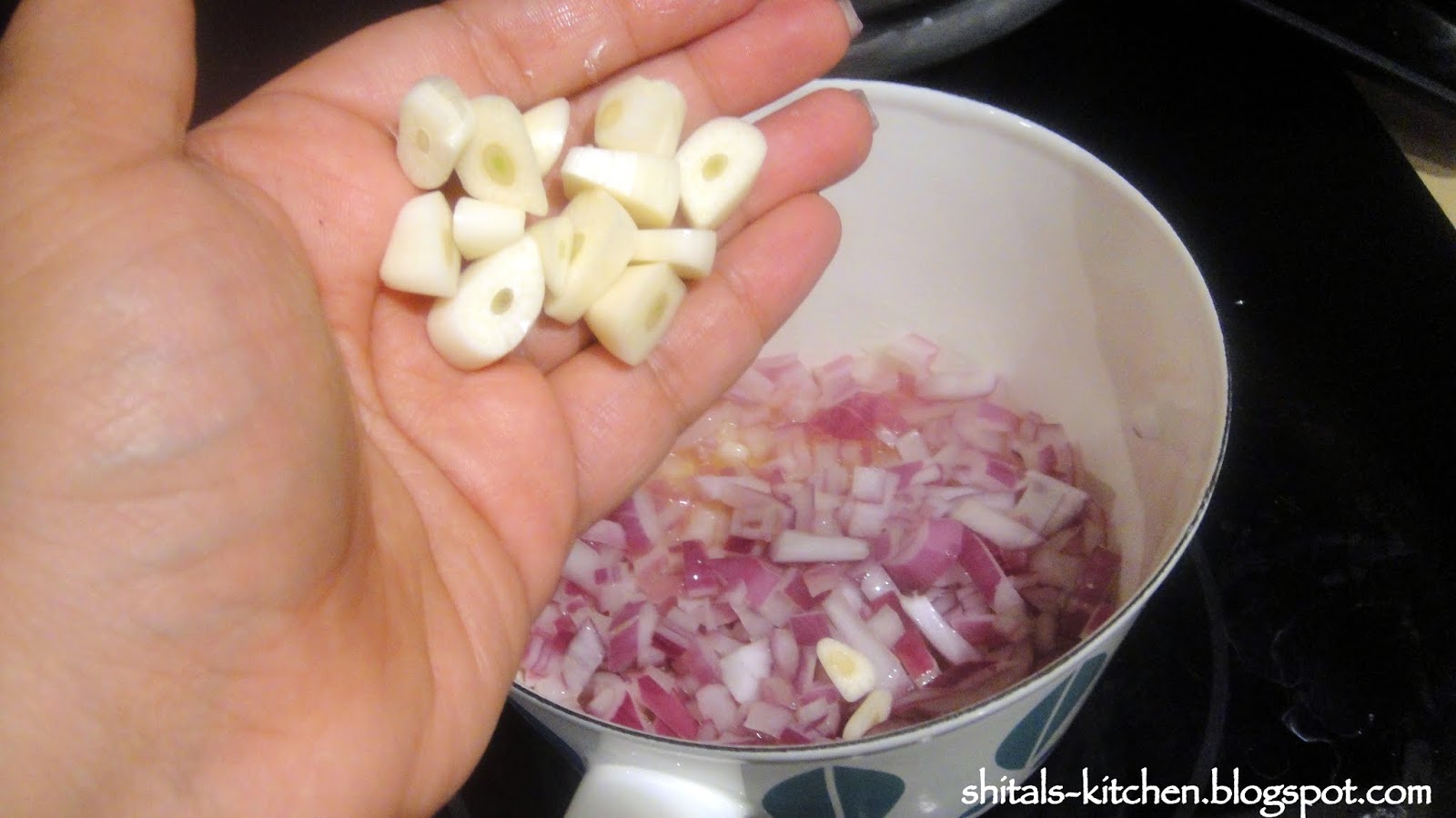 1 tbsp olive oil. add 1/2 cup chopped onions and 3-4 cloves garlic.