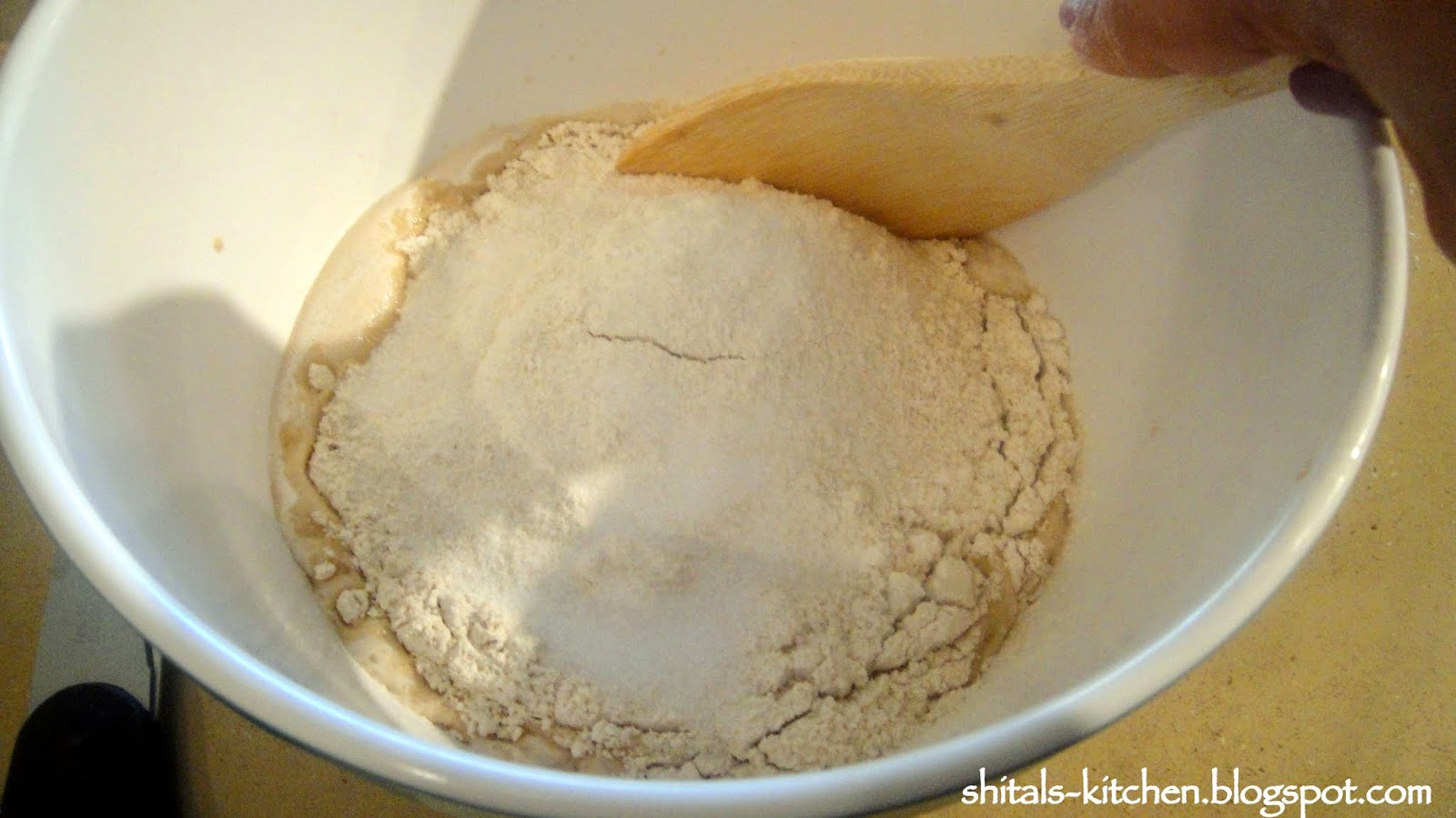 Add 1 1/2 cup whole wheat flour, 1 tsp. salt, and mix well with a wooden spoon till the dough comes together.