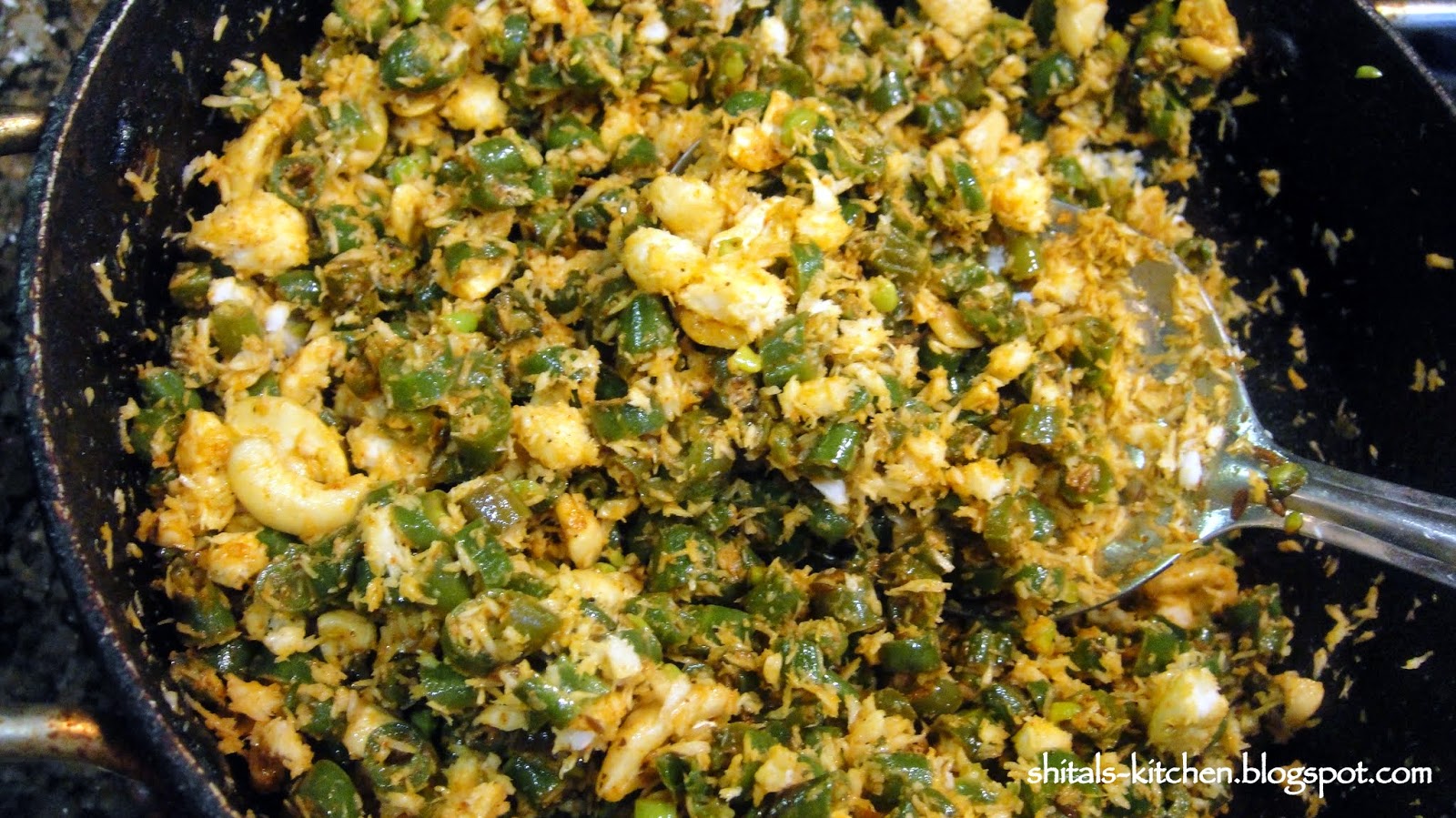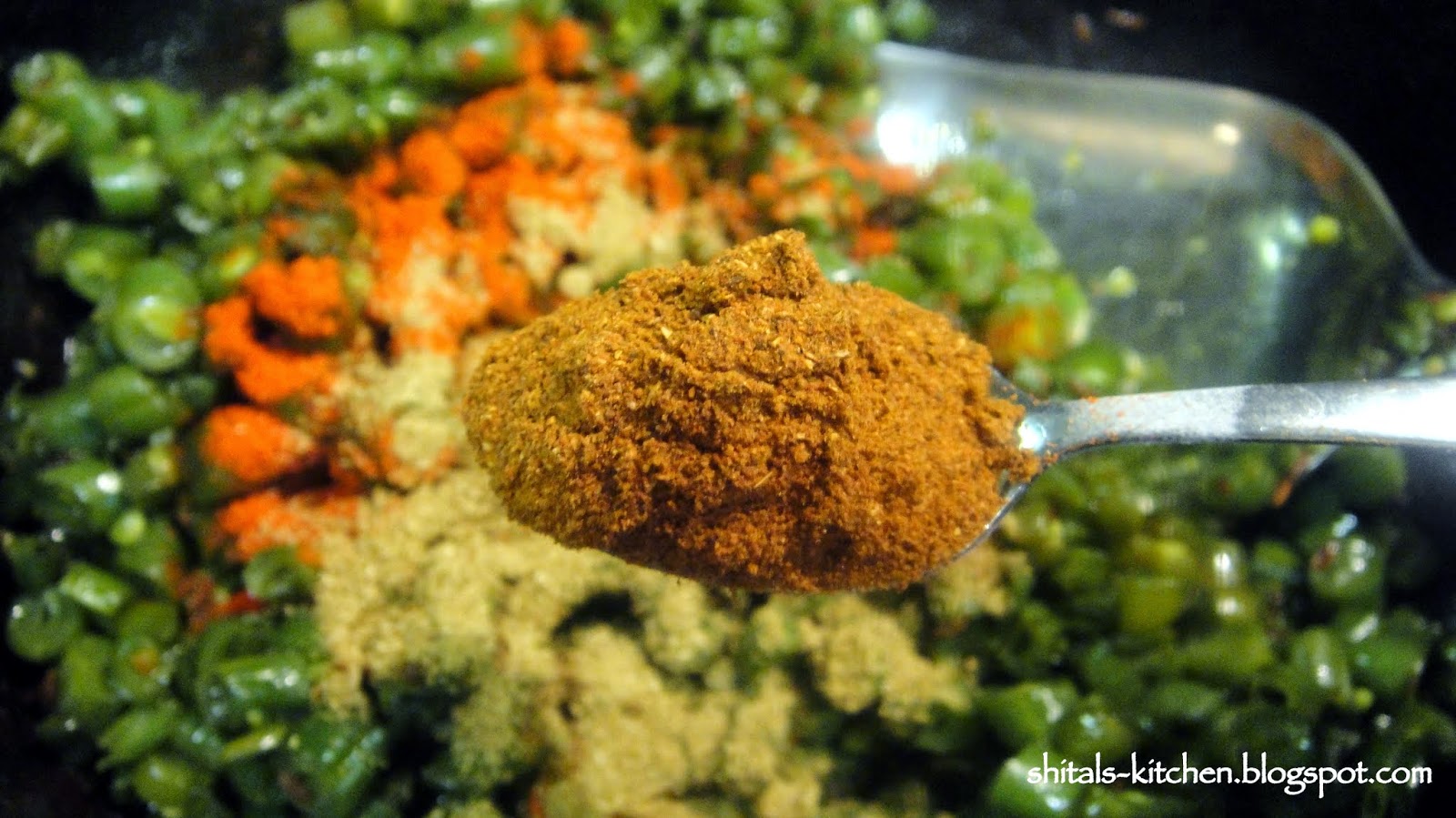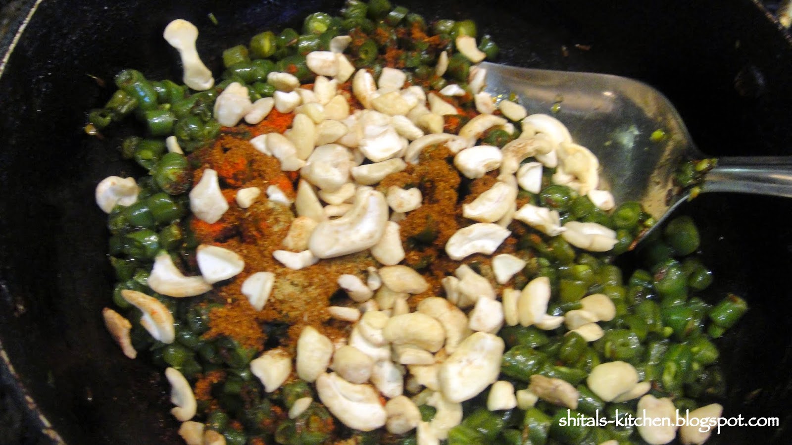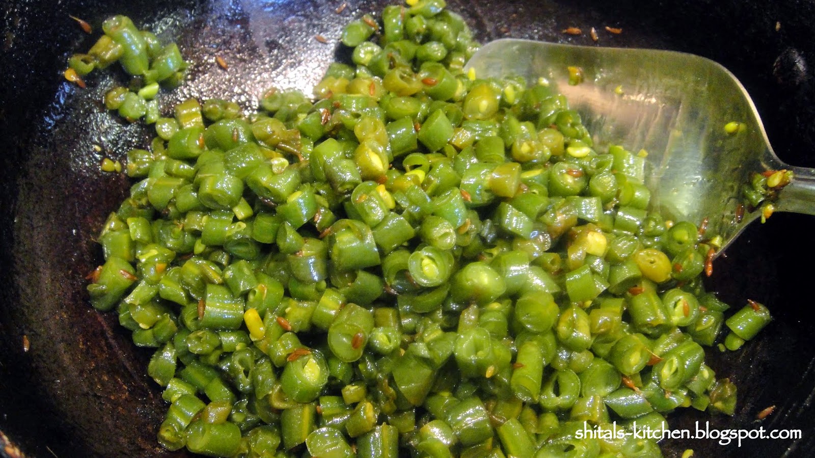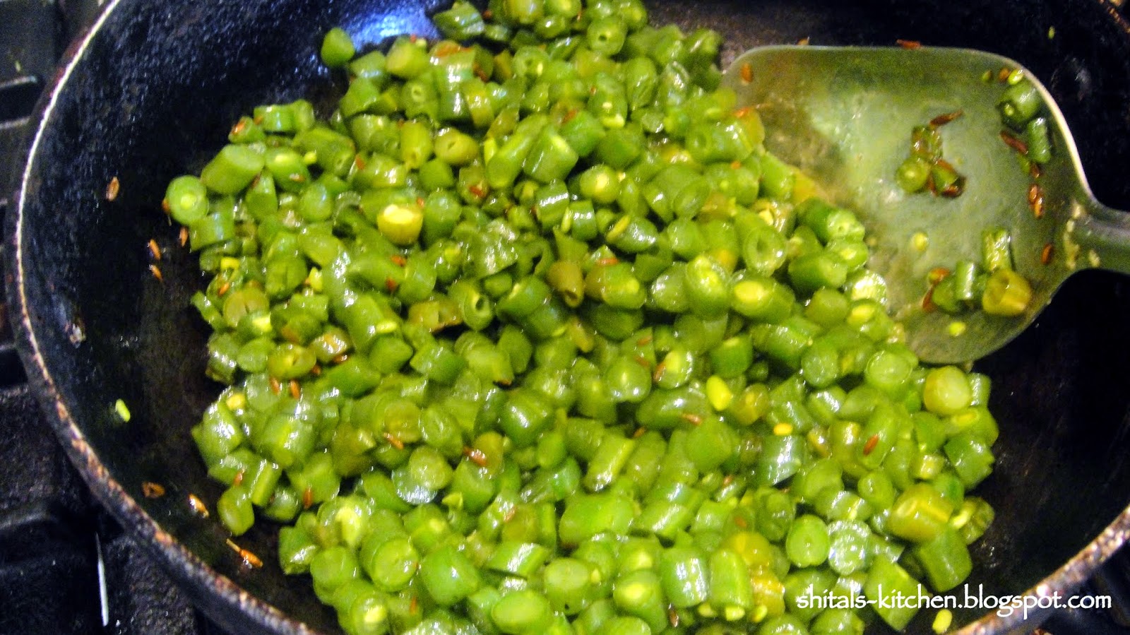 Heat a tsp. of oil. Add 1 tsp. cumin seeds. Add chopped green beans. Add 1 tsp salt and 1/4 tsp. turmeric. Mix well. Cover and cook for 5-7 minutes.
