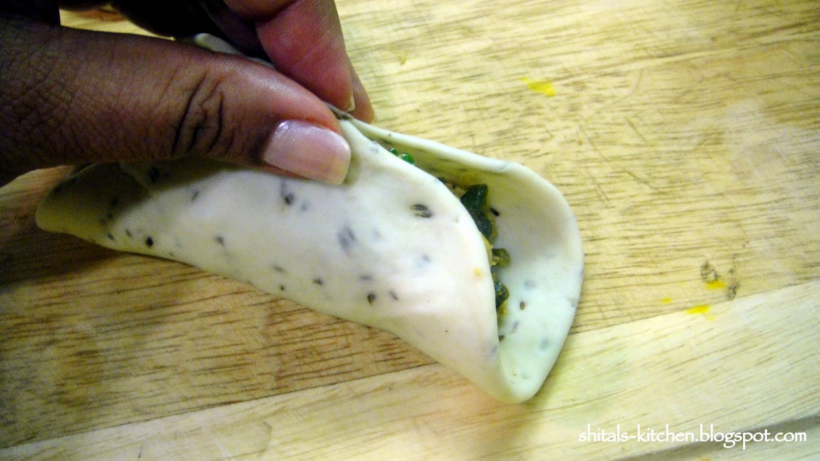 Add around 1+1/2 tbsp. mixture in it. Bring the edges together and press the dough tight.