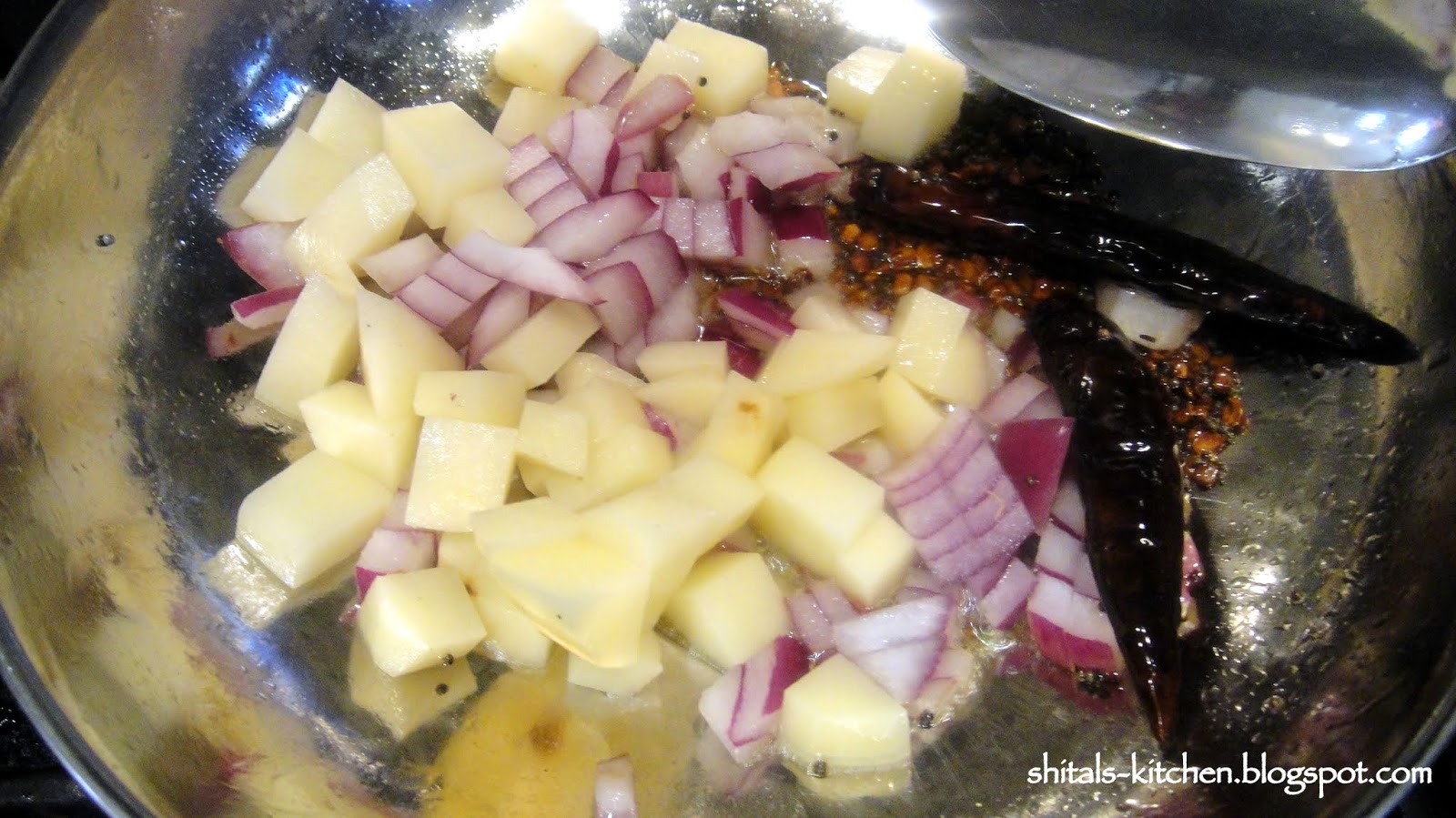 Heat 2 tsp. oil in a pan. Add 1 tbsp. Urad dal/ white lentil, 1-2 red chillies, 1 tsp. rai/mustard seeds.