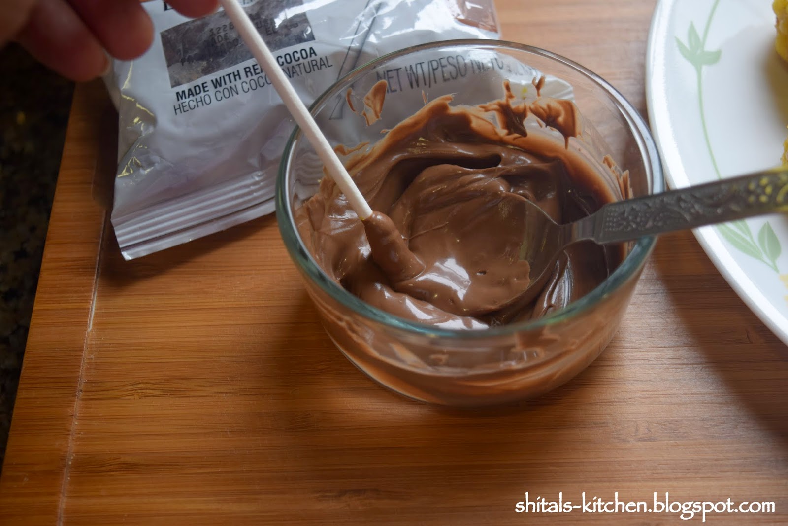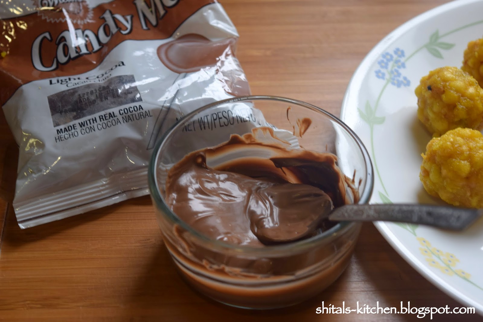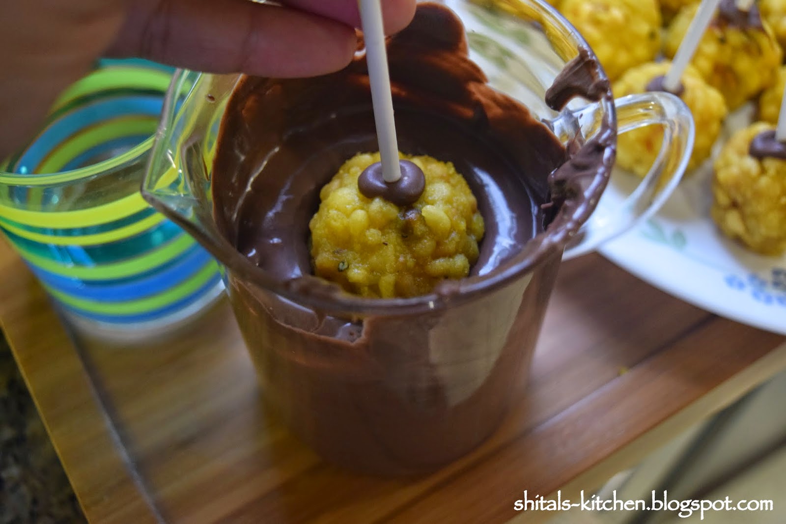 I thought of making a dessert. Since this was a kids friendly get together, I wanted to make something that all kids love...yes boondi ladoo and chocolate. The combination of two on a stick gave rise to 'Choc-A-Boo Pop'. Got it??? Choc-A-Boo like Peak-A-Boo....Choc for chocolate and Boo for Boondi...Chocolate covered Boondi Pop!! :)