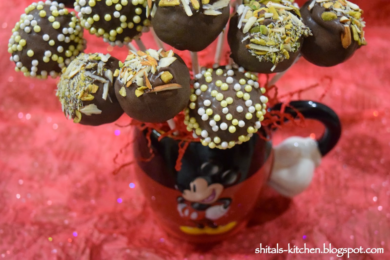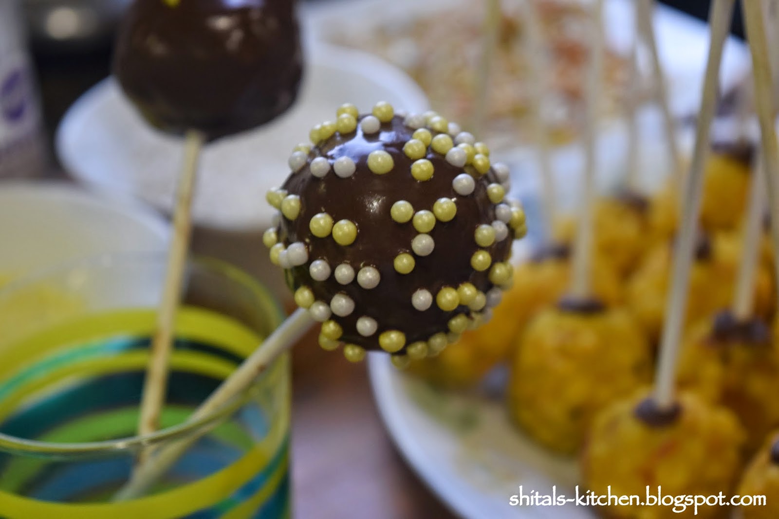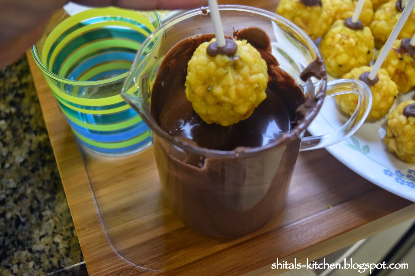 I thought of making a dessert. Since this was a kids friendly get together, I wanted to make something that all kids love...yes boondi ladoo and chocolate. The combination of two on a stick gave rise to 'Choc-A-Boo Pop'. Got it??? Choc-A-Boo like Peak-A-Boo....Choc for chocolate and Boo for Boondi...Chocolate covered Boondi Pop!! :)