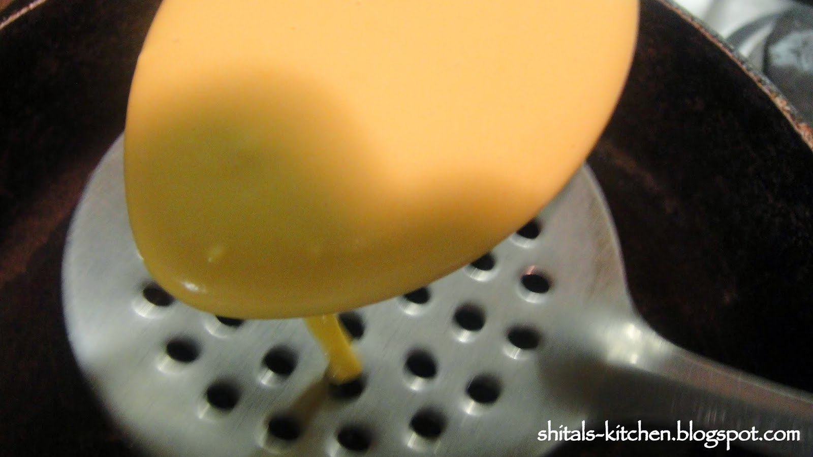 hot ghee, pour 2-3 tbsp. batter on it. The batter starts falling into