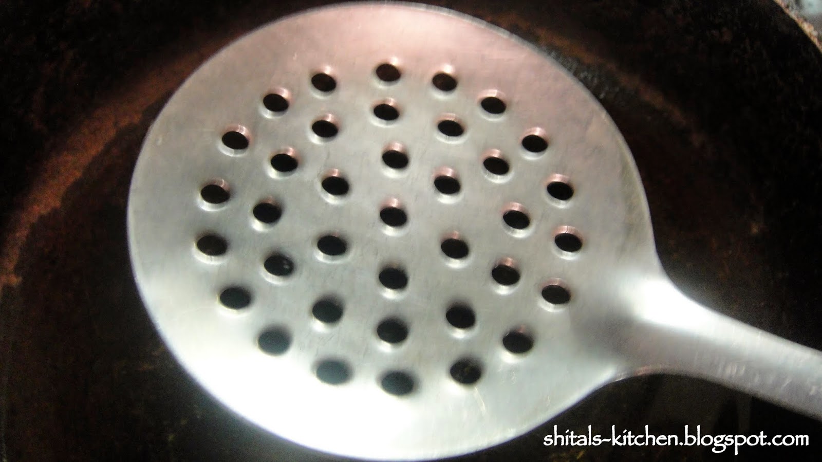 Heat ghee in a frying pan. Using a perforated ladle (boondi jara) over