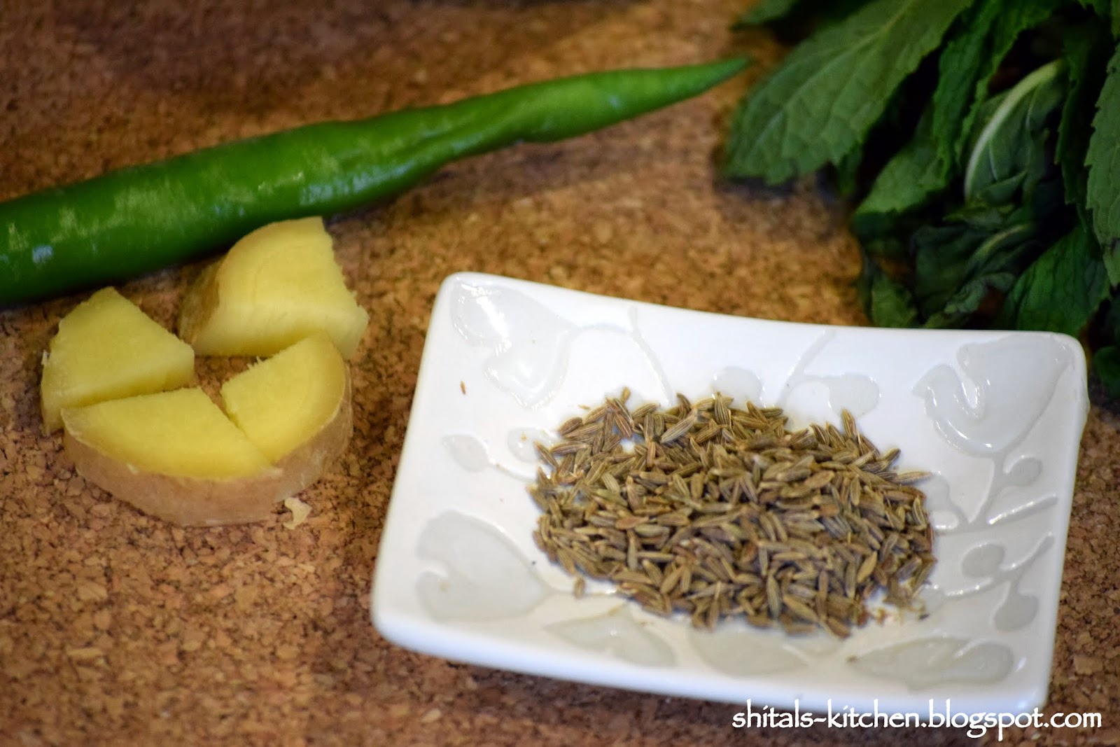 Grind mint, chillies, ginger. and cumin with 1/2 cup guava juice to form a smooth paste.