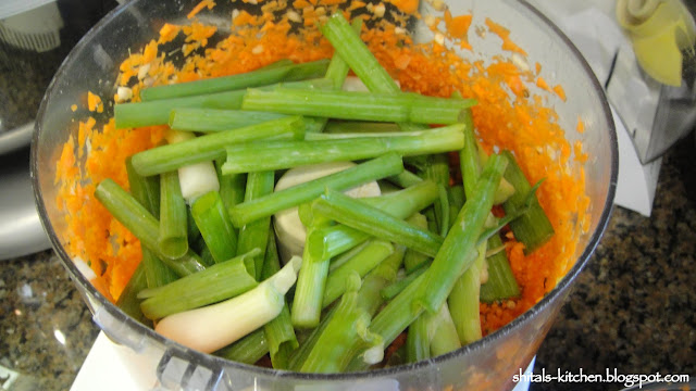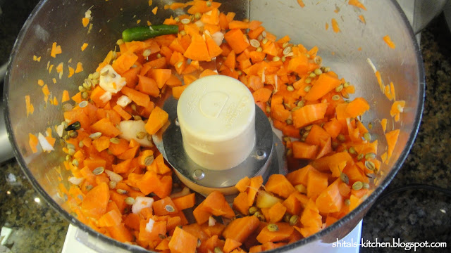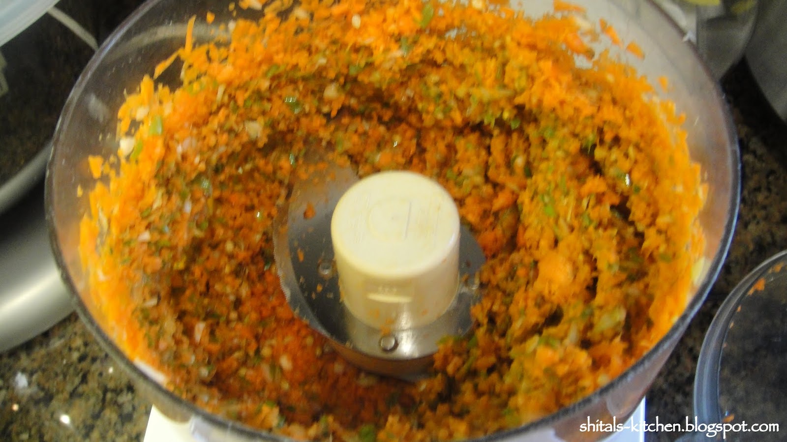 - In a food processor mince carrots, ginger, garlic, green chillies, spring onions, coriander seeds.