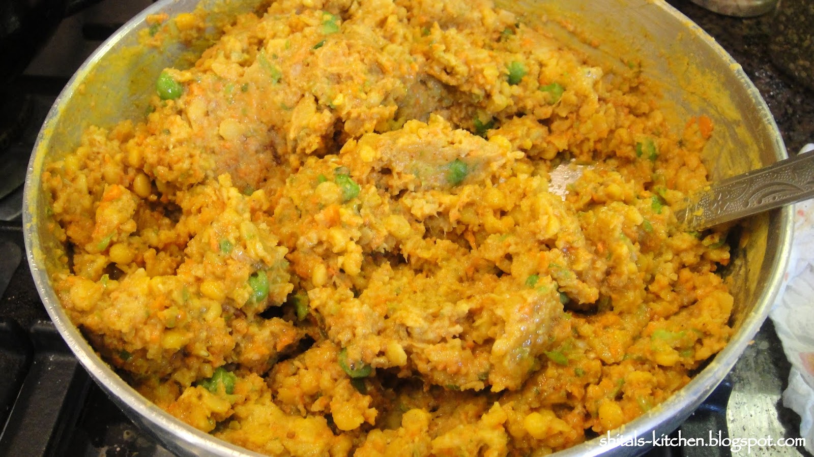 Dip your palm in water or oil. Spread handful of dal and sabz mixture