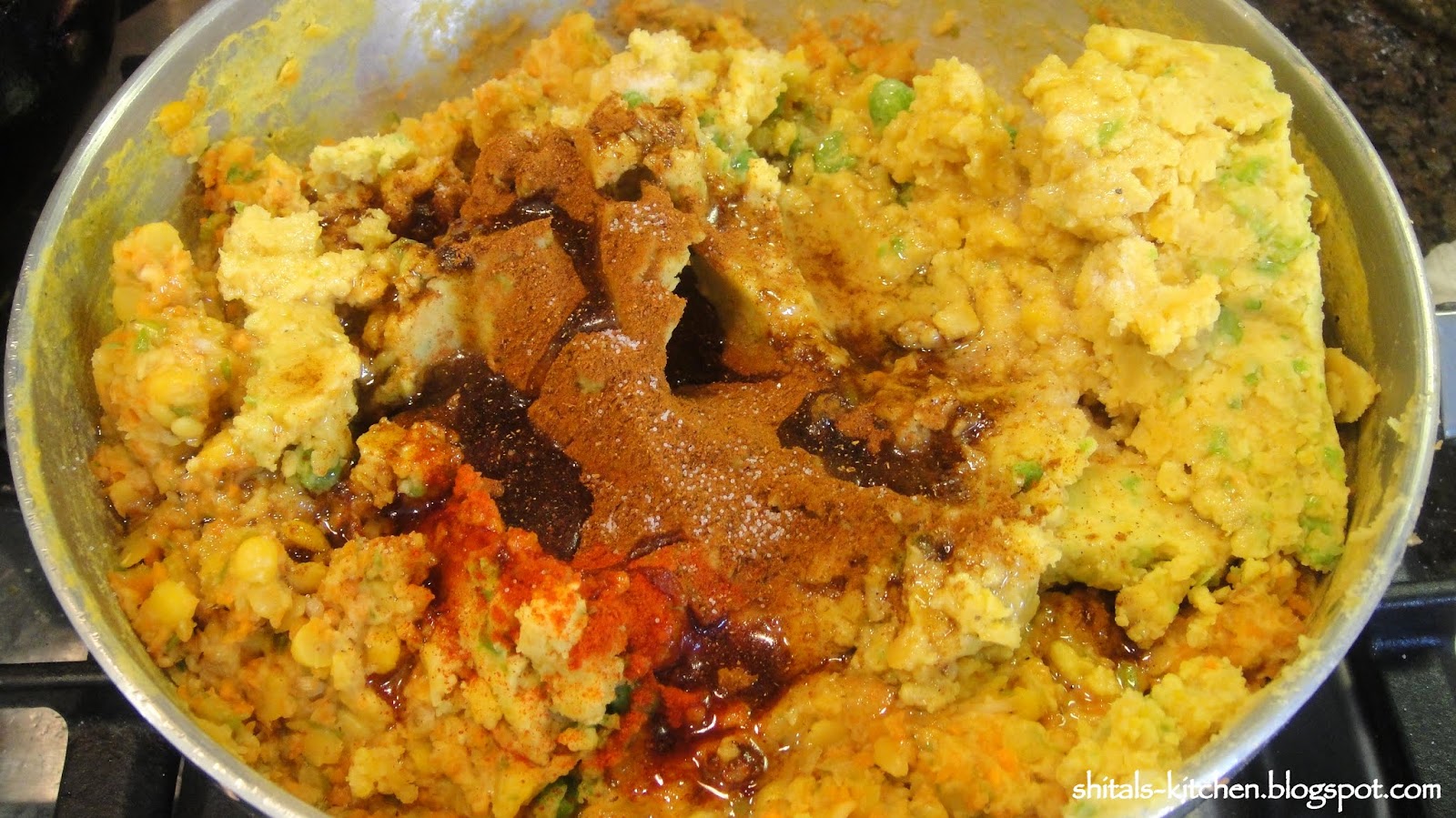 Add poha and rawa to the mixture. This will absorb all the moisture and help to bind the mixture.
