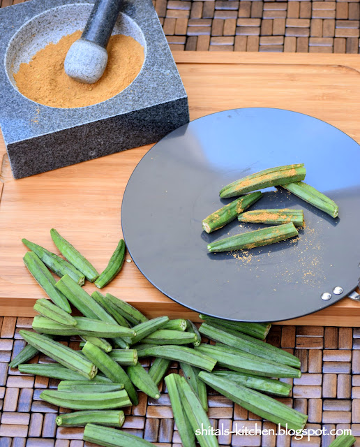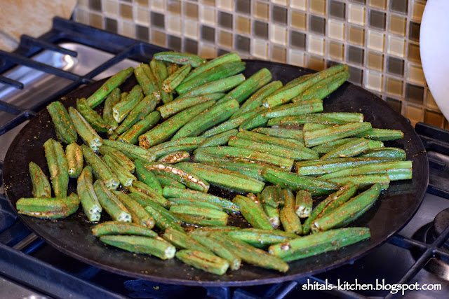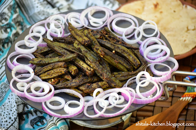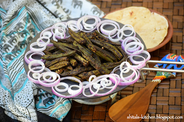 I just enjoy rustic food... bhindi/orka stuffed with spice mixture and cooked on an iron griddle or skillet till it is slightly crisp, goes so well wrapped in freshly made rotis. As soon as my husband entered the house through the garage door, I heard him say "Yummy'. He had no idea what the dinner was, but just the aroma triggered his brain to express it that way! :)
