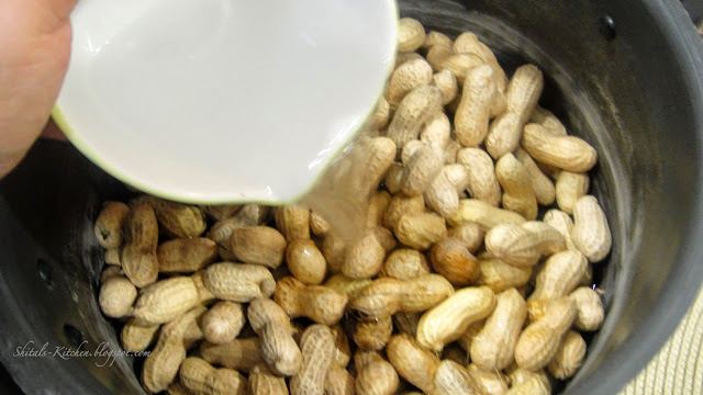 - Put peanuts in the pressure cooker and pour water over them. You need enough water as all the peanuts need to be submerged in water and water level being around 2 cm. over the peanuts. Peanuts will float in water.