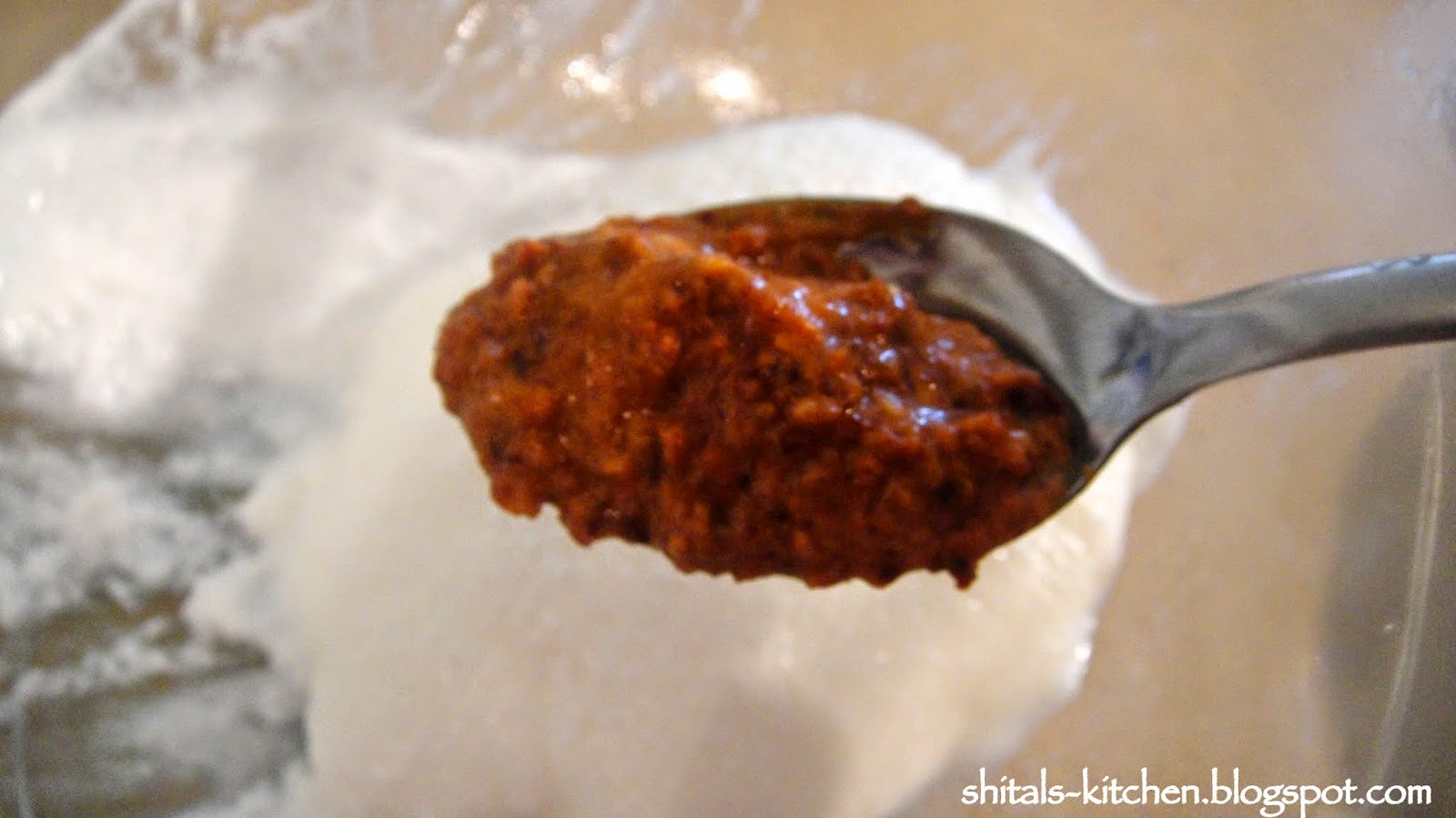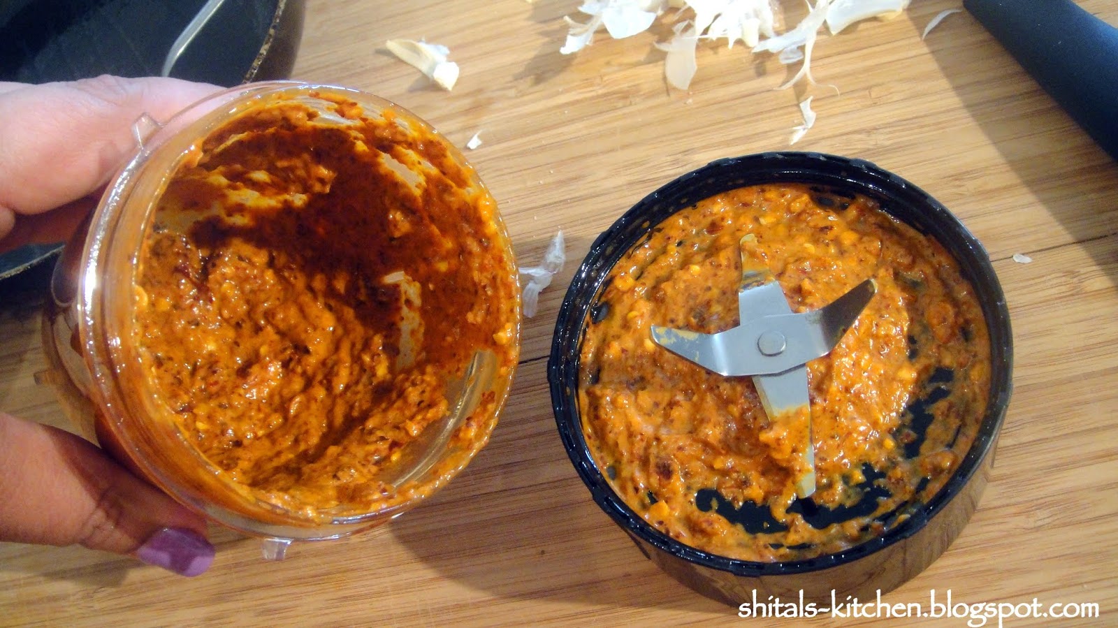 Grind fried chillies with remaining oil, 3-4 cloves of garlic, and salt.