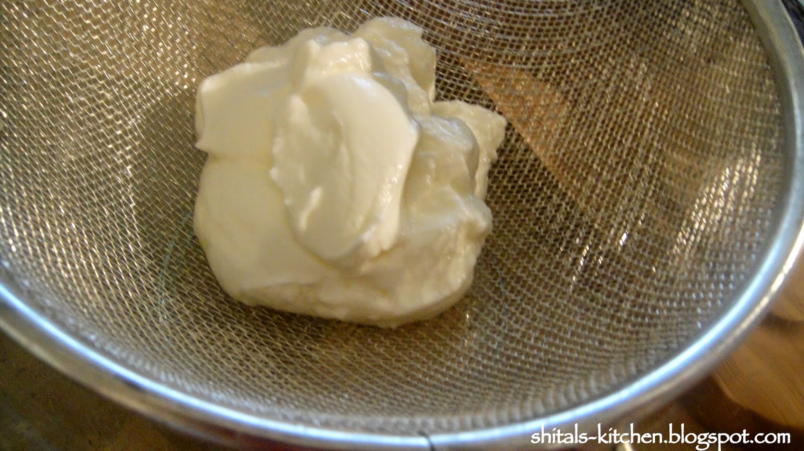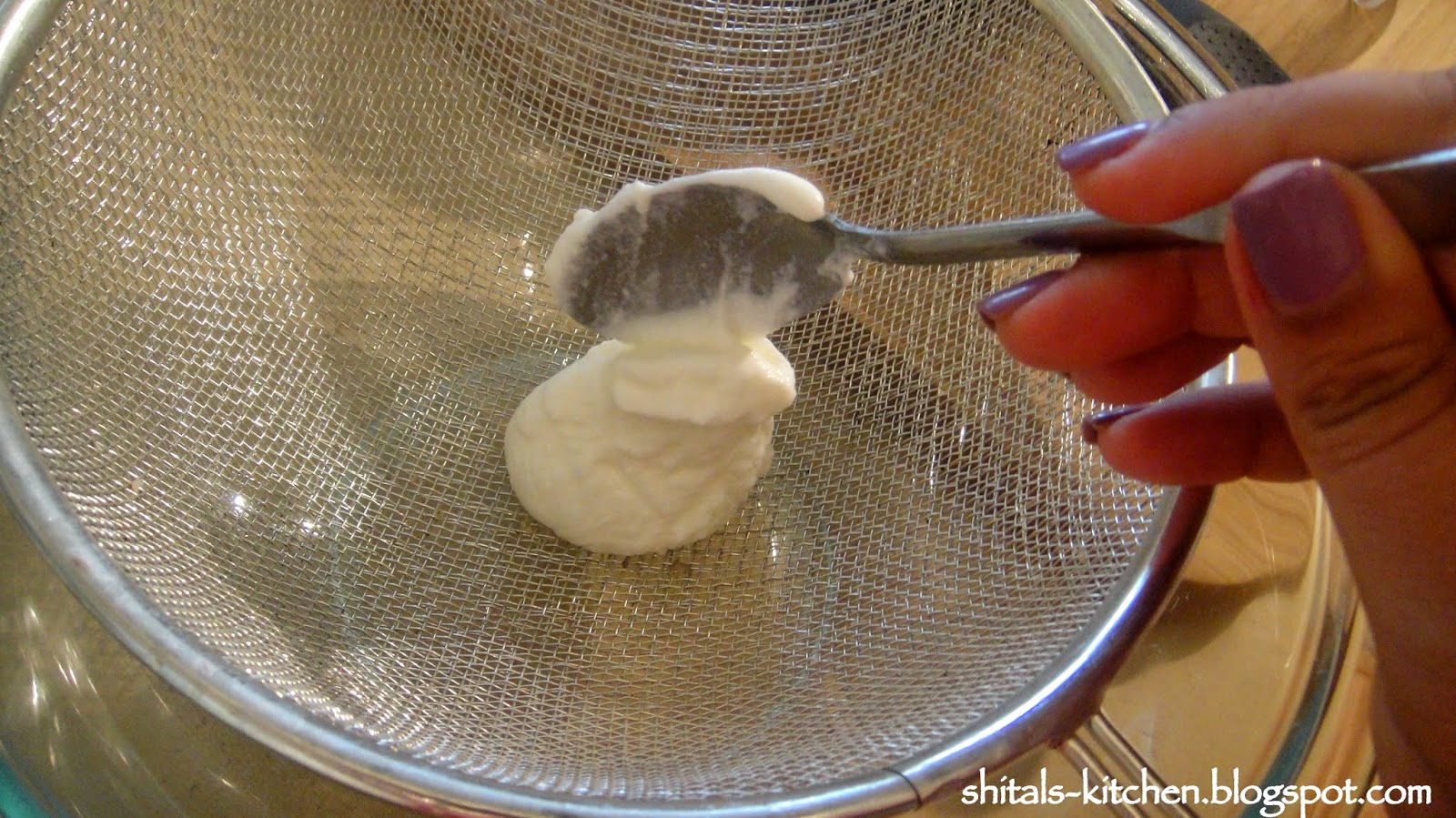 I use a sieve/mesh and let 1 cup yogurt rest in there for an hour. Water from yogurt easily drips in another bowl. That water can be used to make yogurt drink or could be added to make the bread dough.