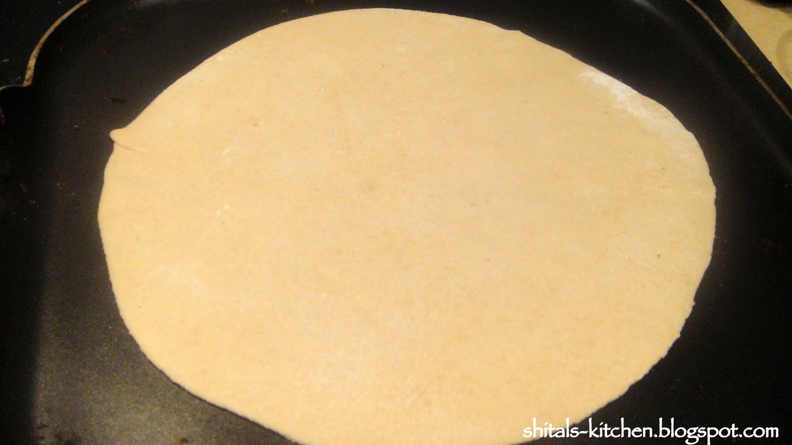 On a hot griddle, place rolled roti/bread and roast on both side for around 20-25 seconds on each side. Do not press the flat bread. That might make it crisp and difficult to roll.
