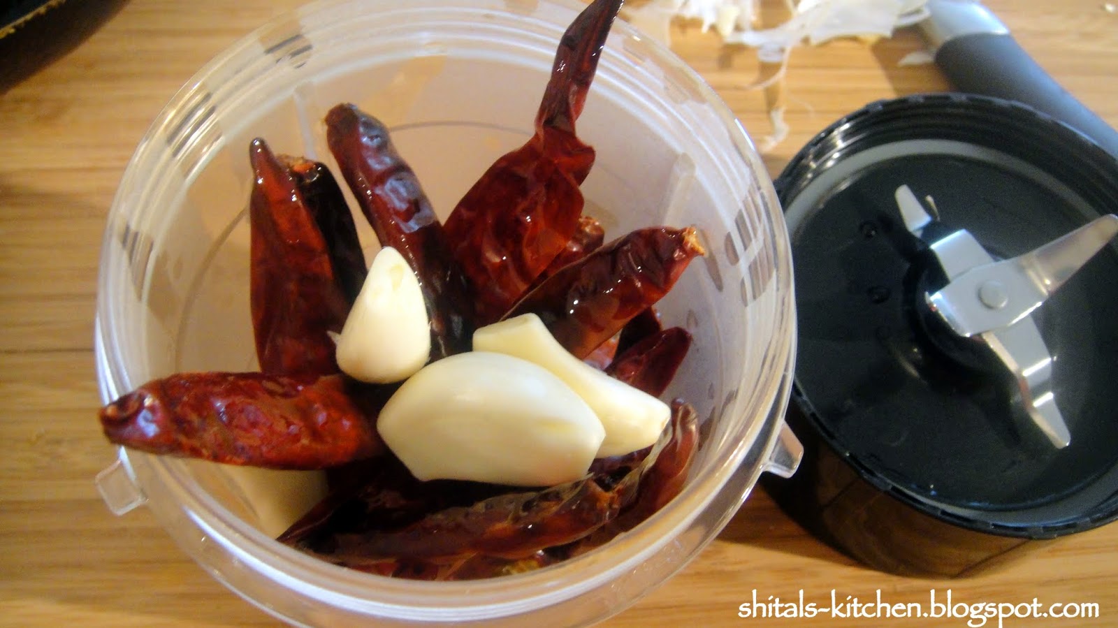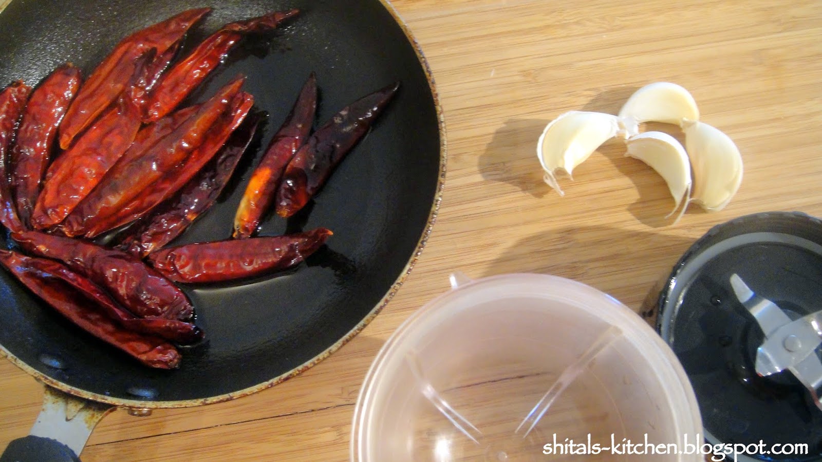 Heat 2 tbsp. oil. Turn of the heat and fry 15-20 dry red chillies. Let them be in there till the oil cools.