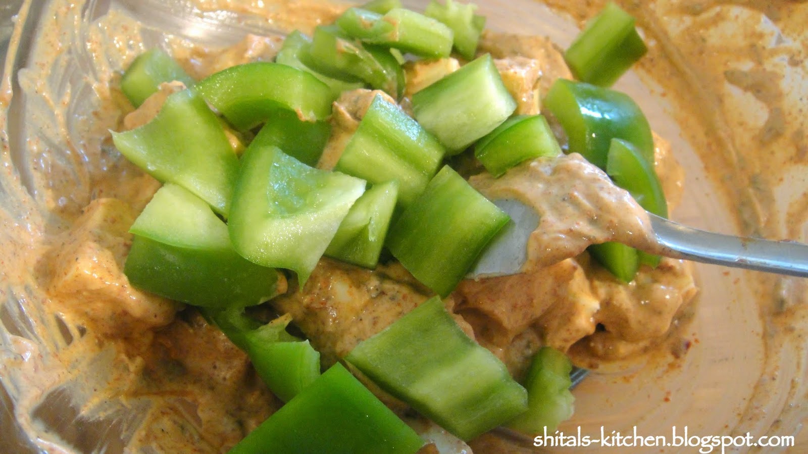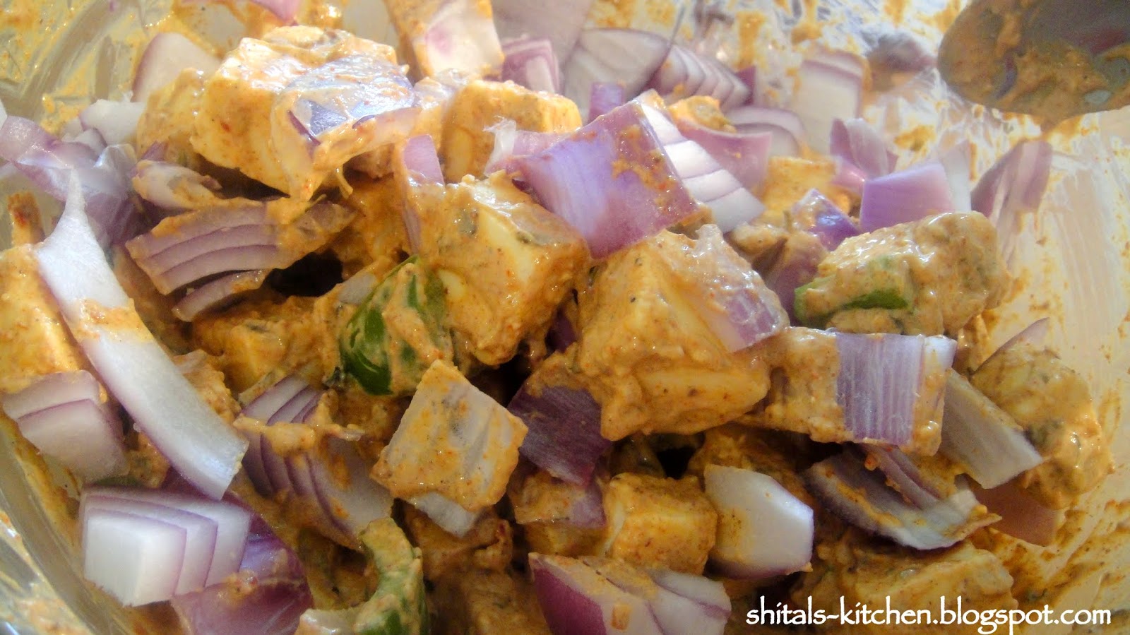Cut 250 grams of cottage cheese/Paneer into bite size cubes. Add to yogurt marinade. Add few bell pepper cubes too. Marinate for 30 minutes.